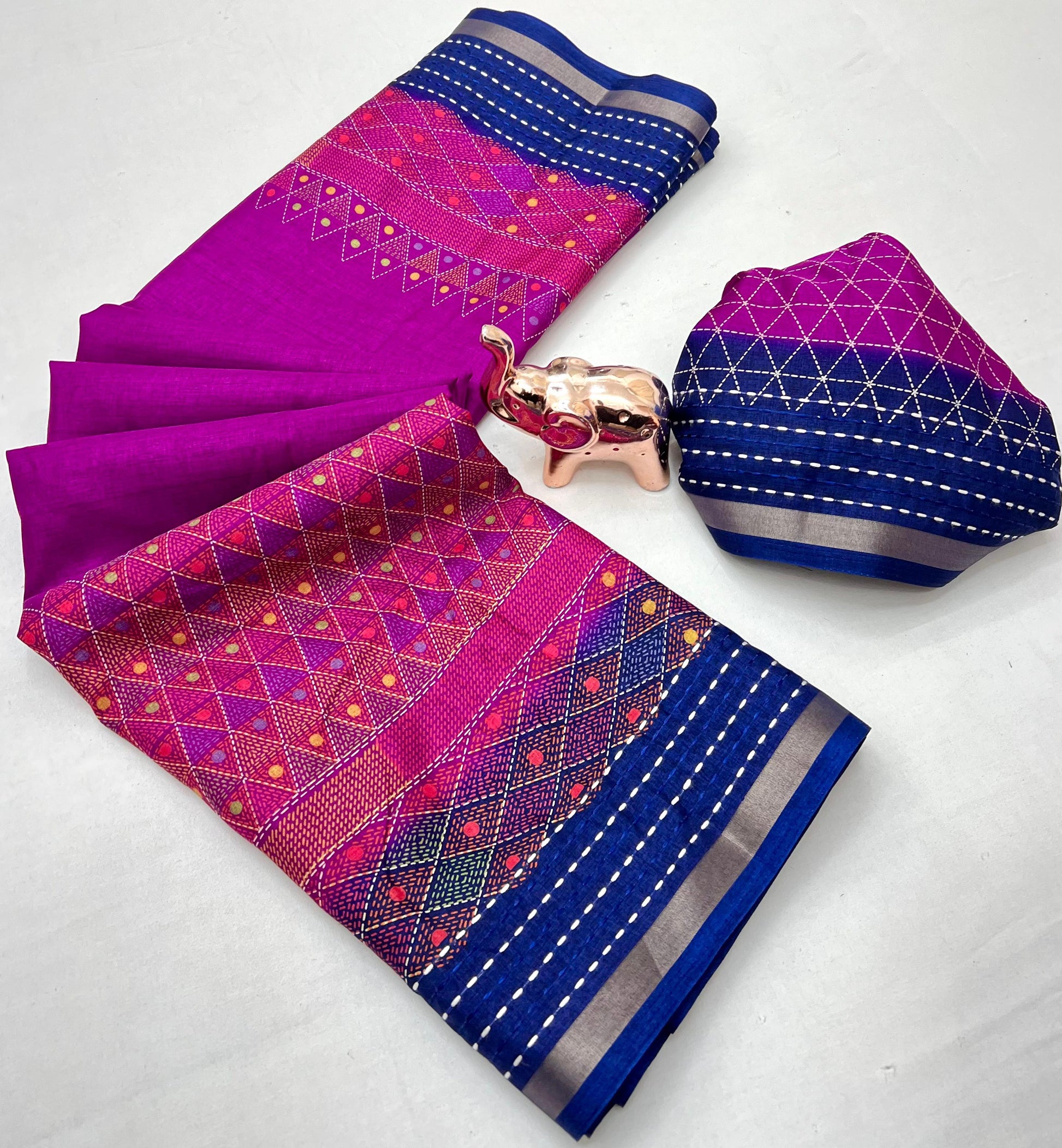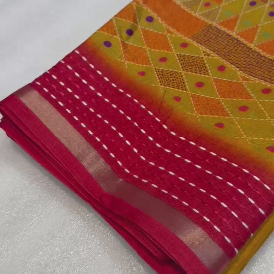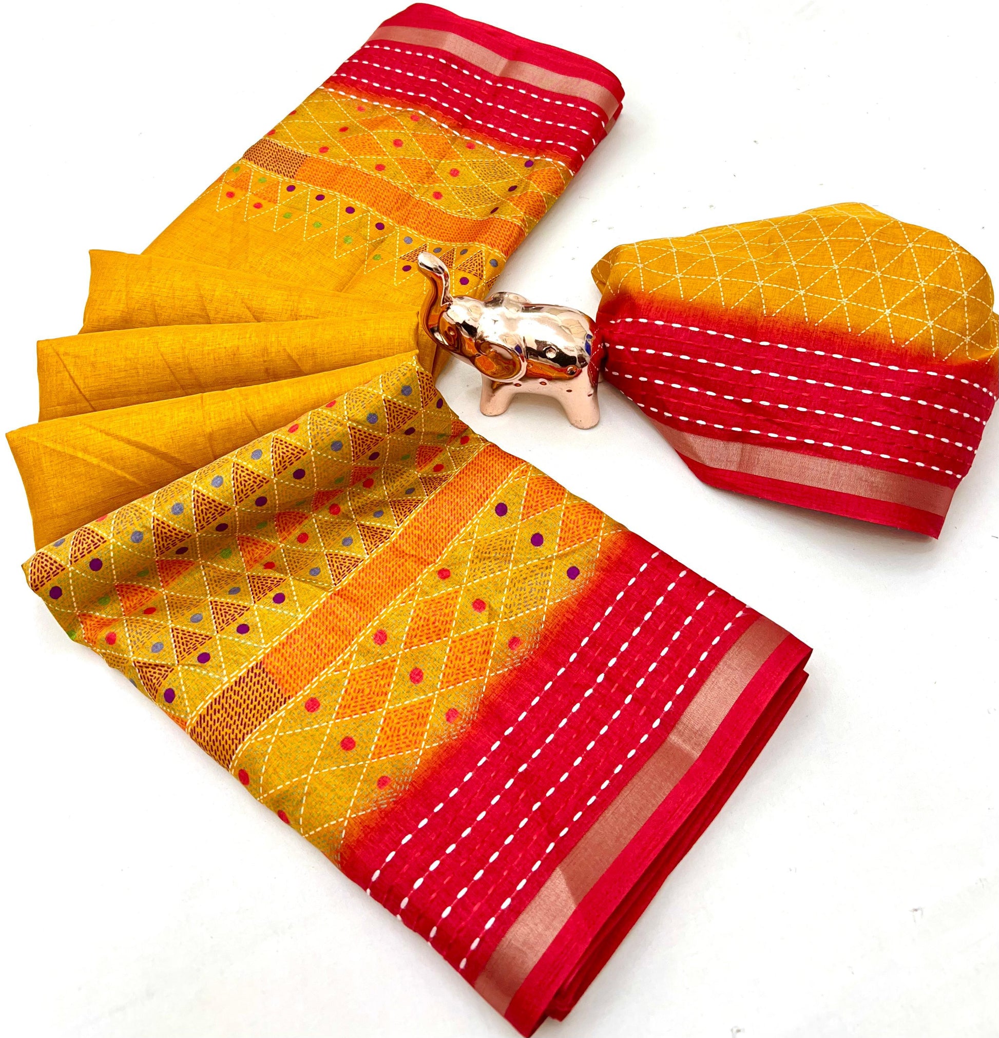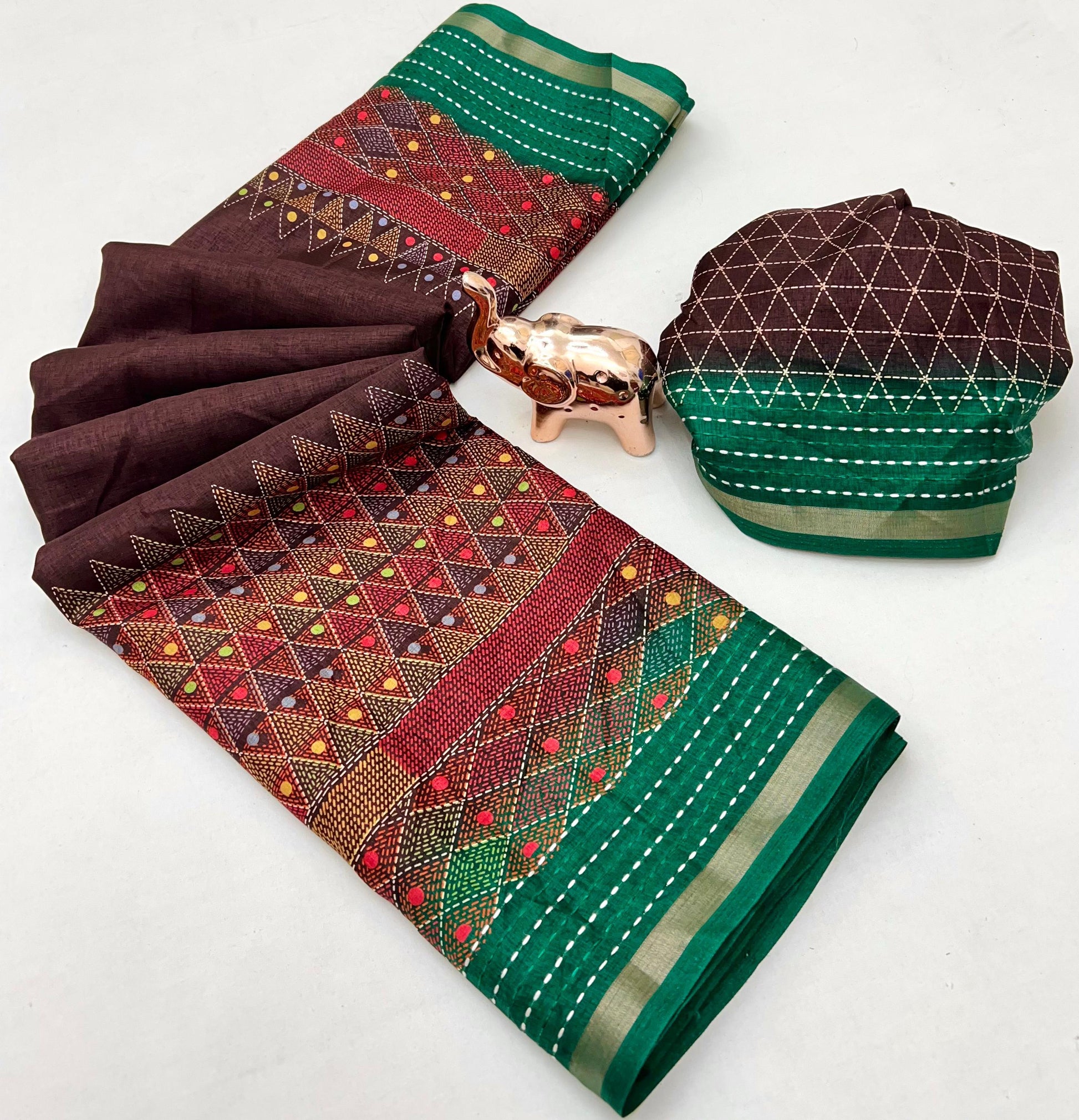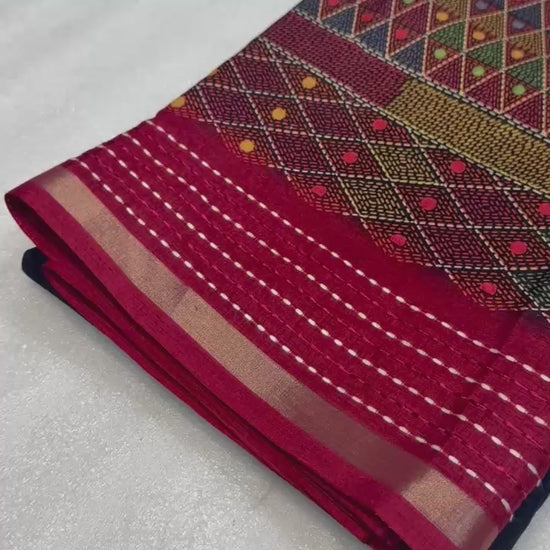 Soft Cotton Crape Printed Saree with Elegant Katha Thread Work border – 6.3 Meters