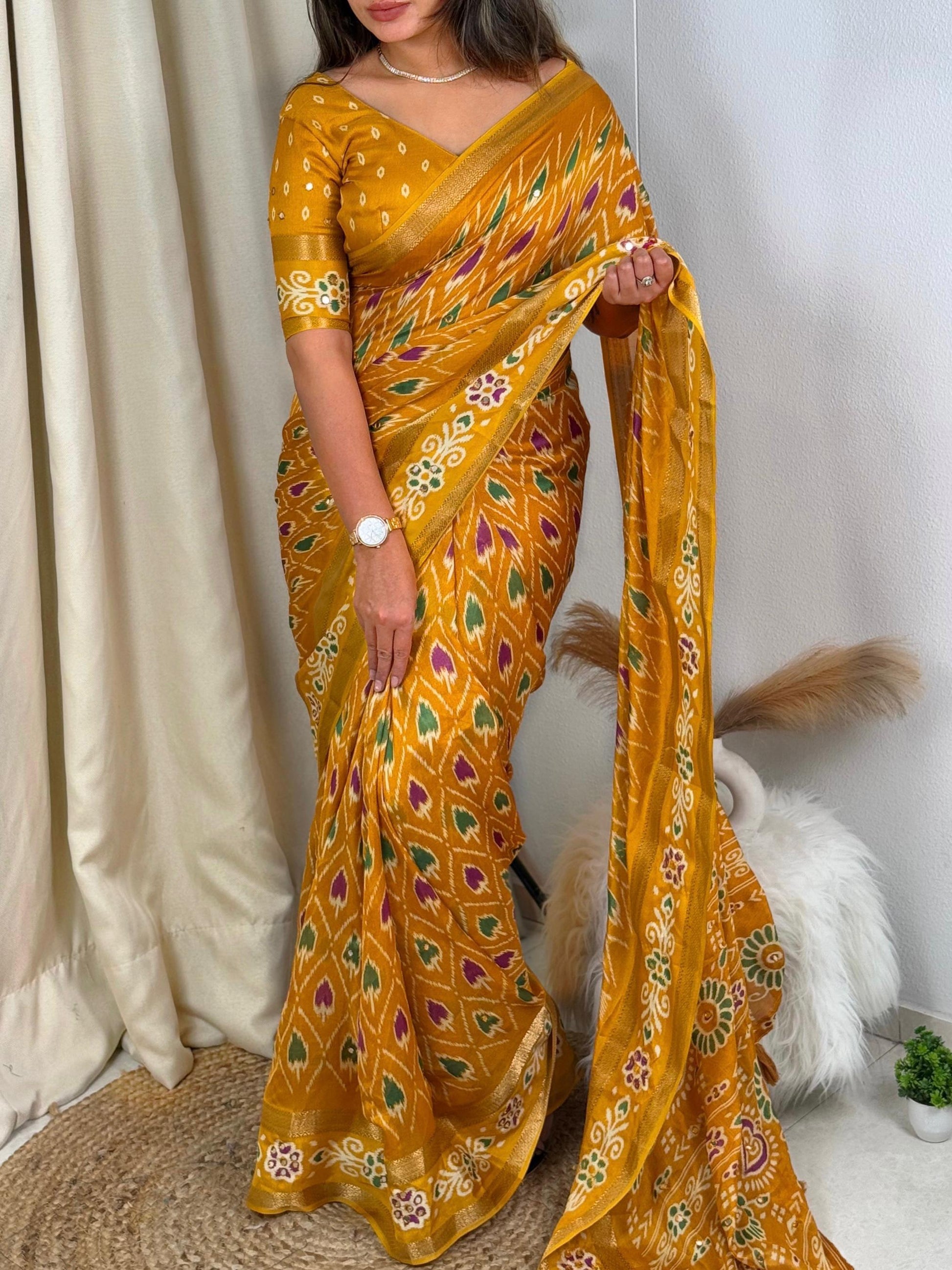 Koyal Pure Georgette Moss Saree with Rajwadi Print, Zari Border & Gota Patti Mirror Work | 6.30m with Running Blouse