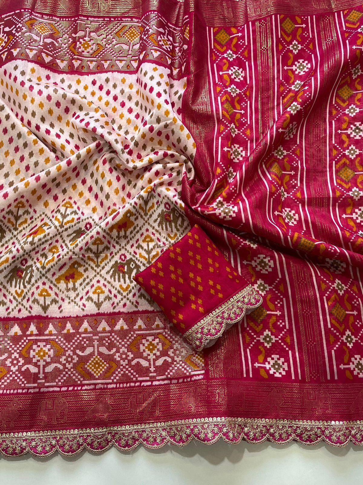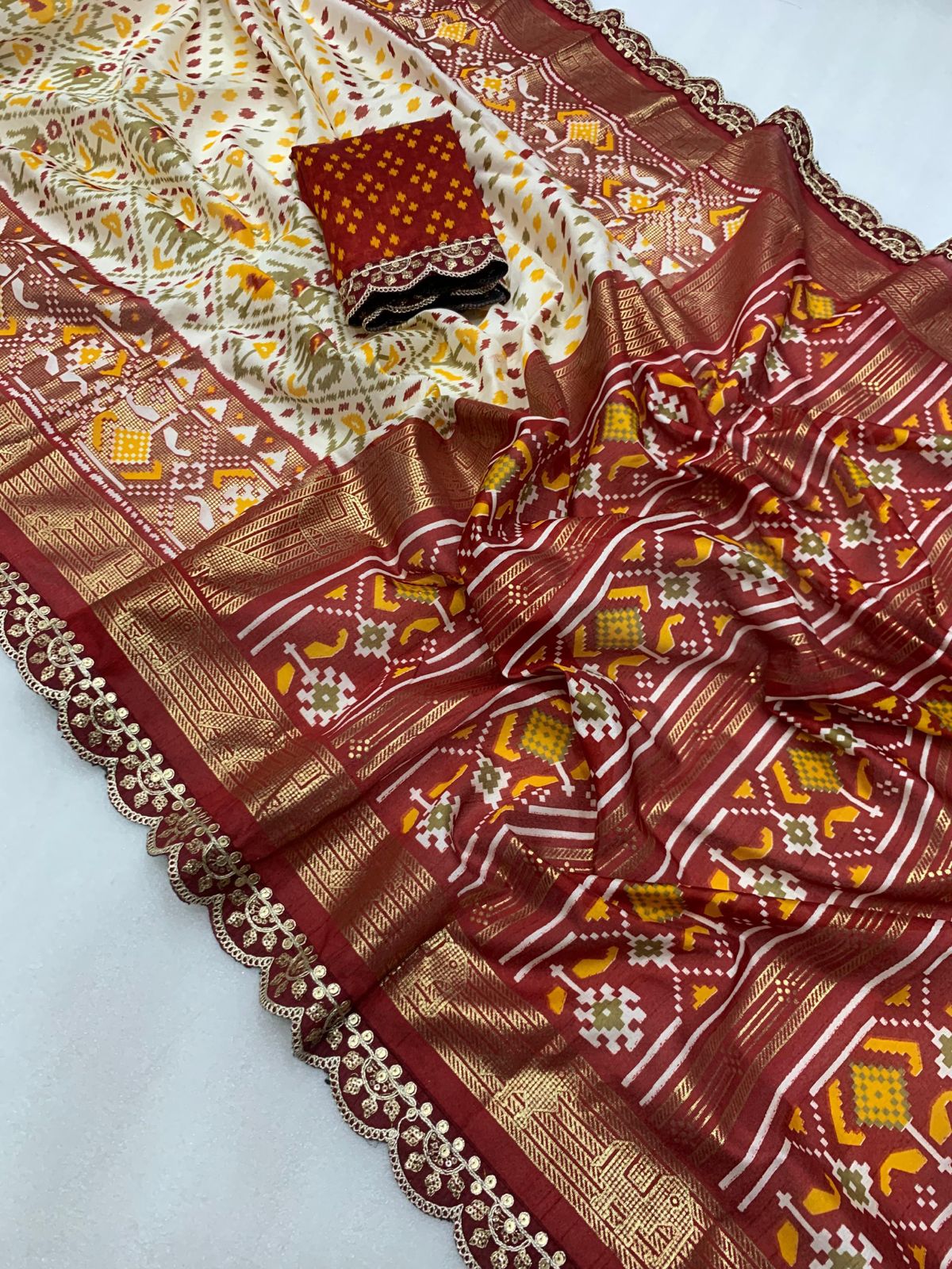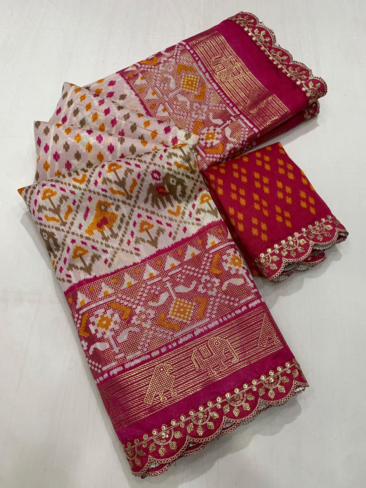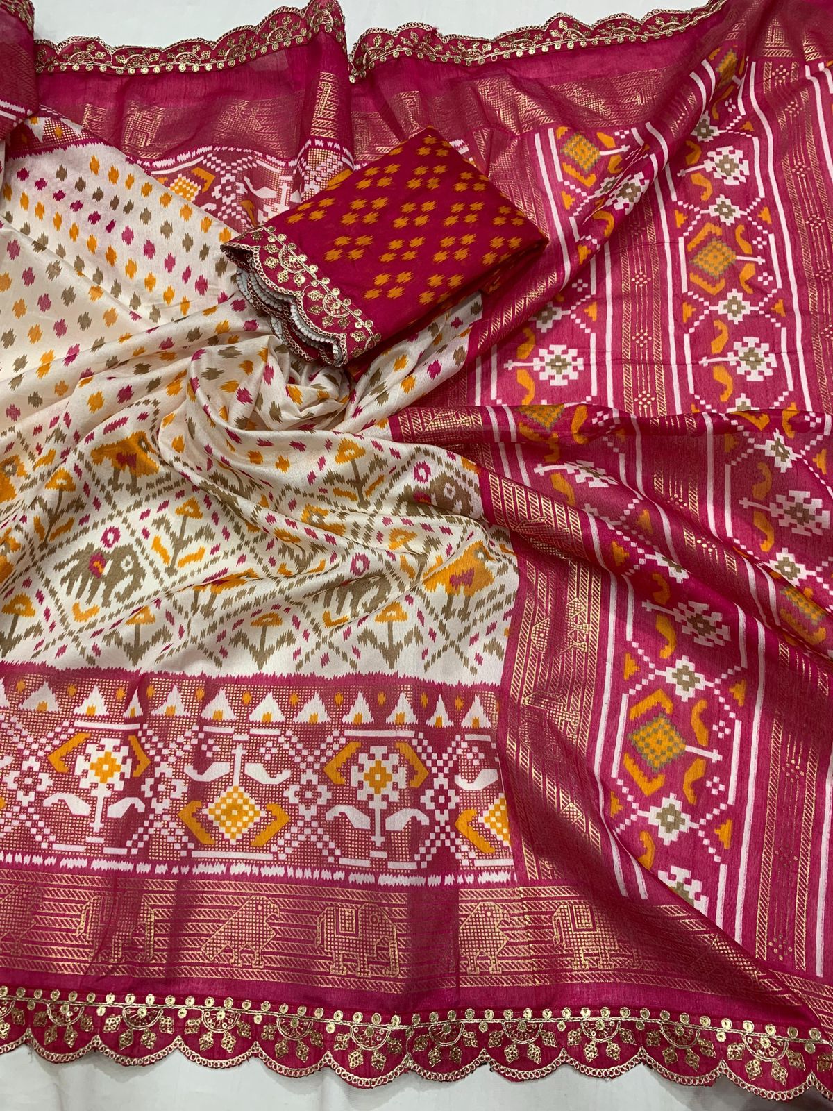 Introducing our exclusive Dola Silk saree, beautifully adorned with traditional Kalamkari prints and detailed scallop maggam work. The saree features foil-printed borders, a stunning foil-printed pallu, and elegant sequin lace work, making it a timeless piece for weddings, festivities, and special events.