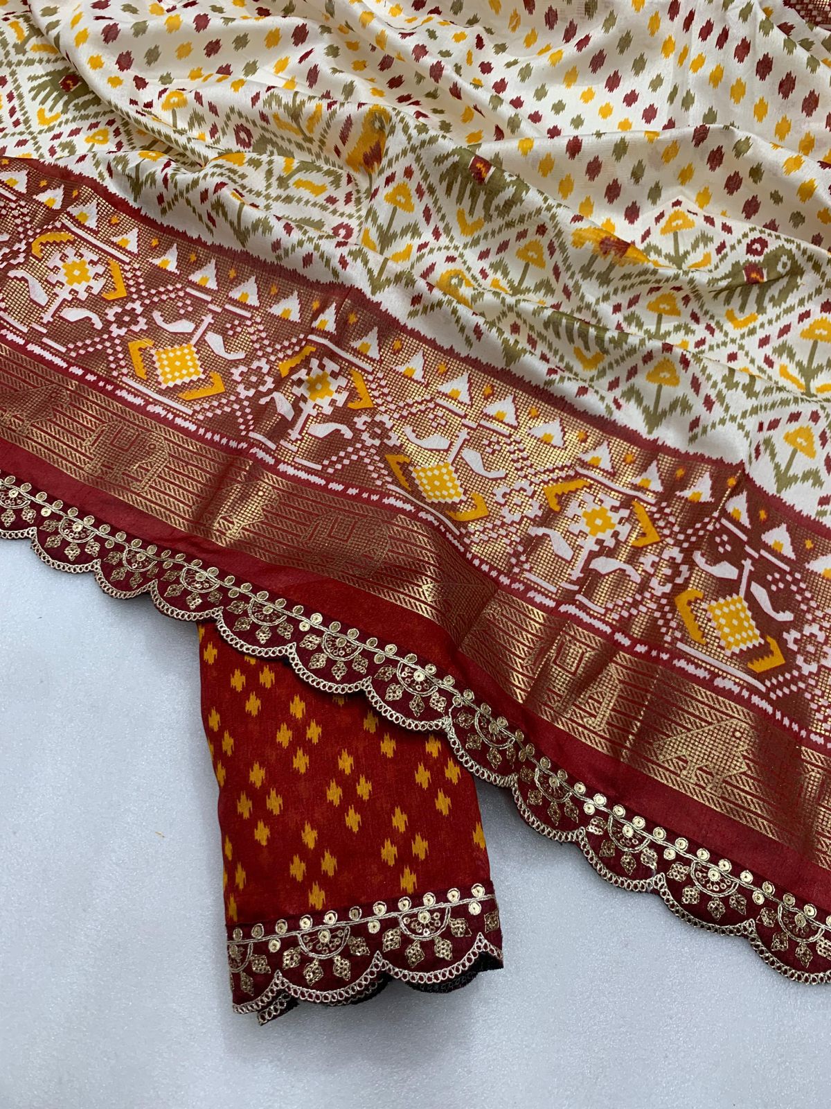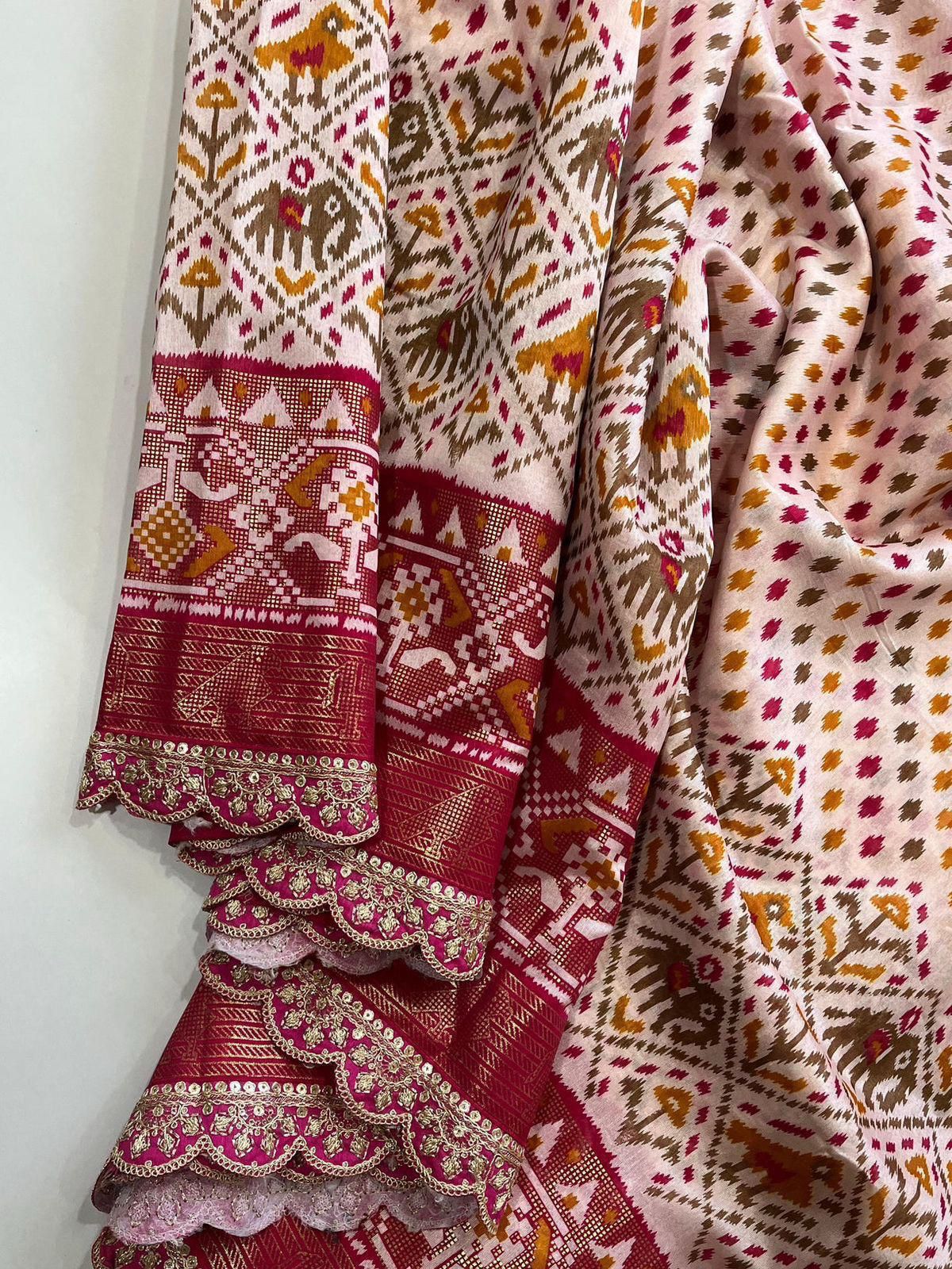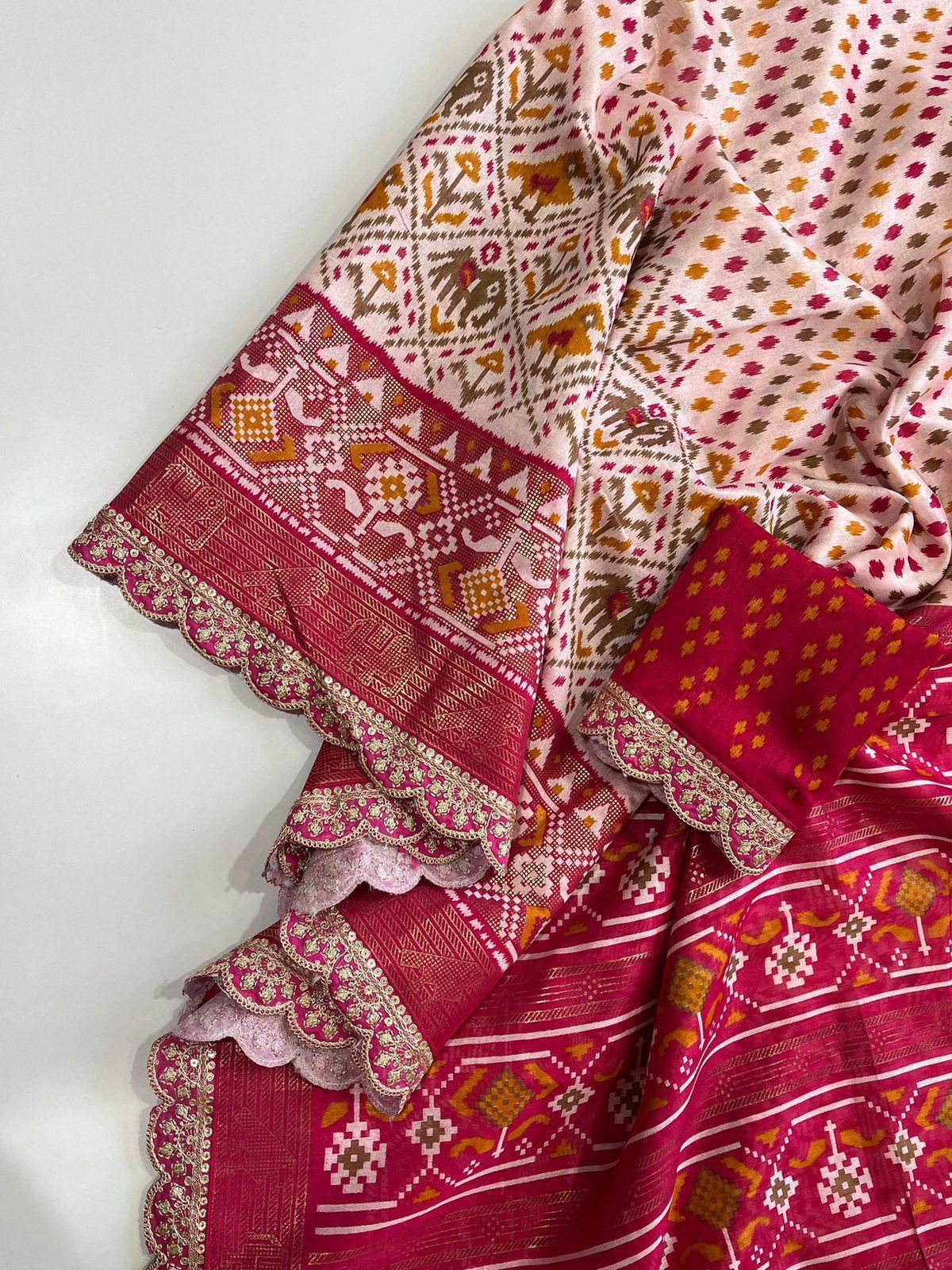 Premium Dola Silk Kalamkari Print Saree with Scallop Maggam & Sequin Lace Work, Foil Printed Pallu & Contrast Blouse | Swaraas.in