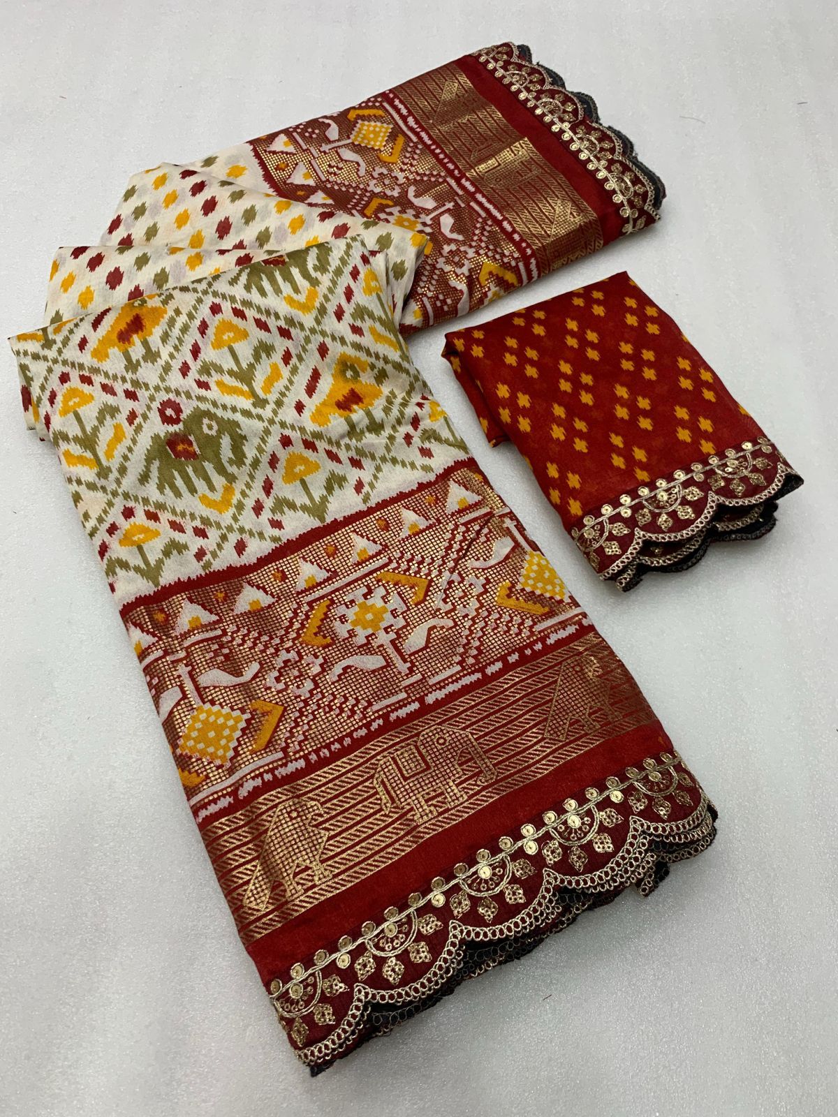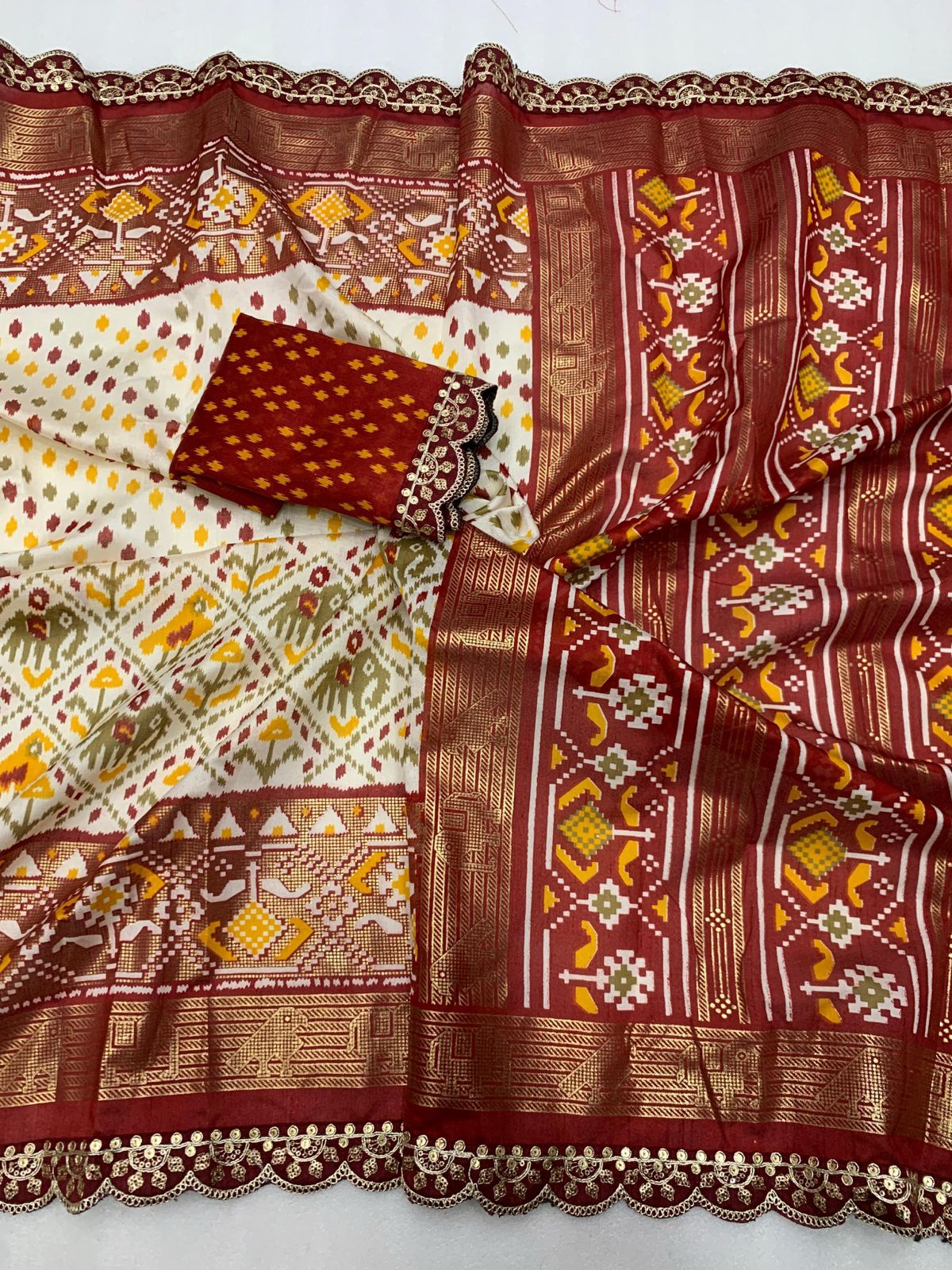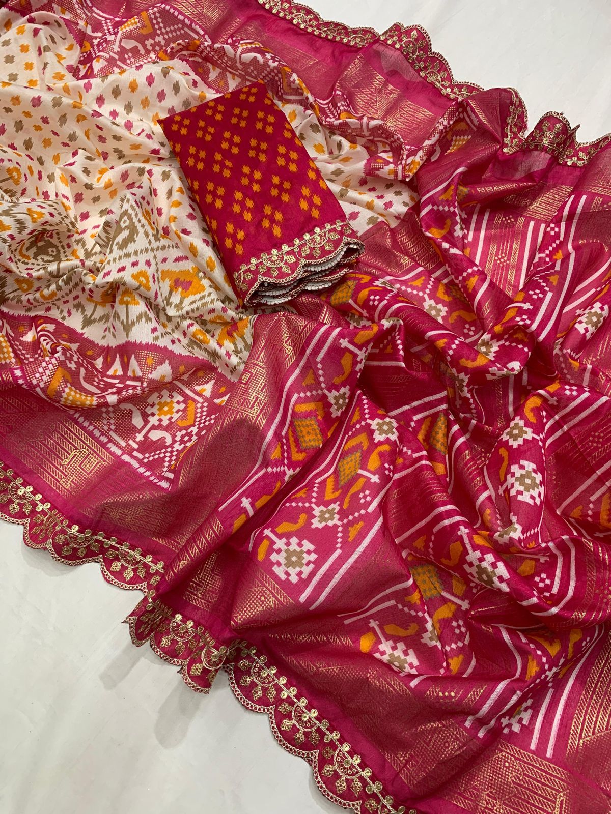 Premium Dola Silk Kalamkari Print Saree with Scallop Maggam & Sequin Lace Work, Foil Printed Pallu & Contrast Blouse | Swaraas.in