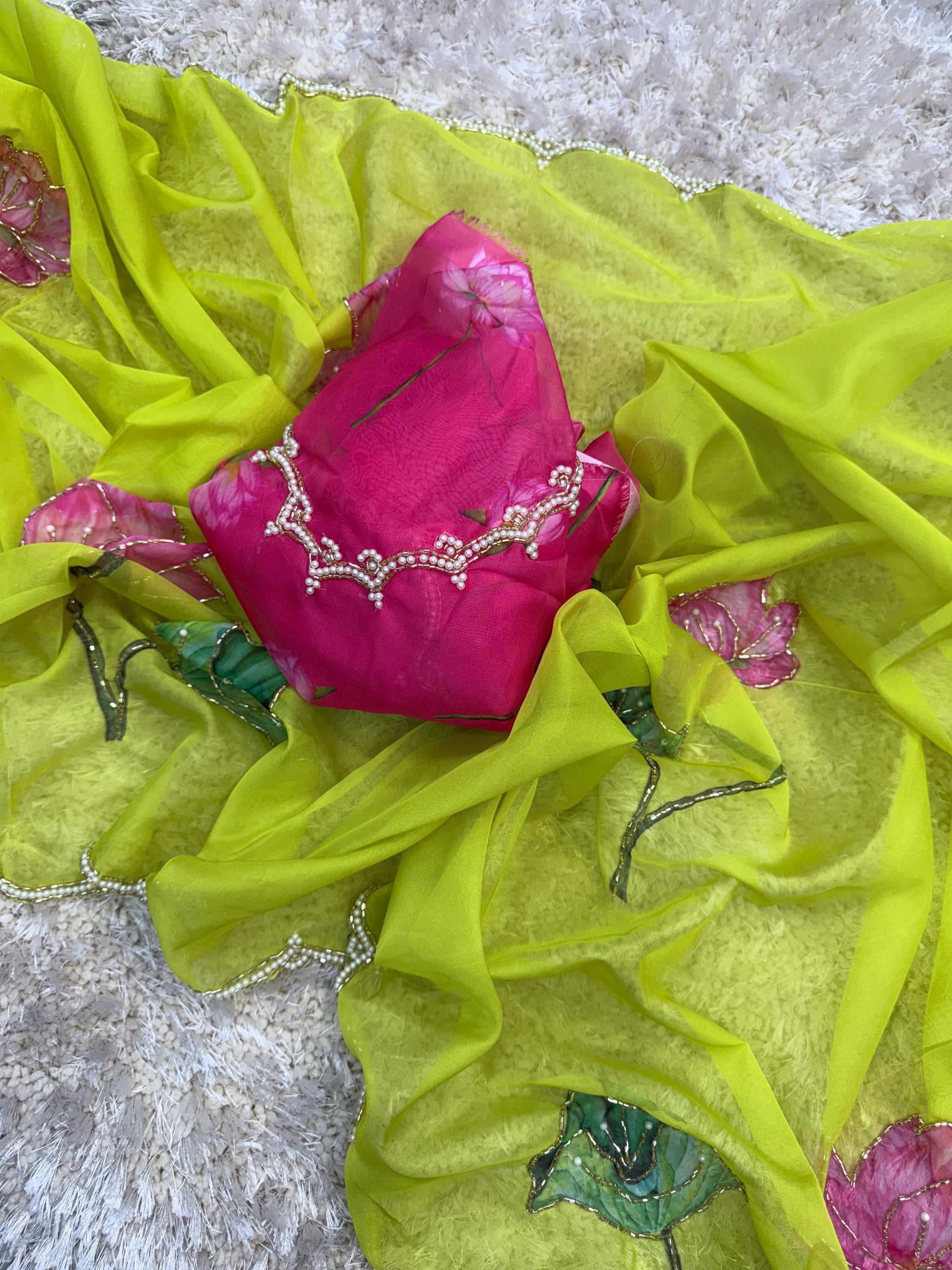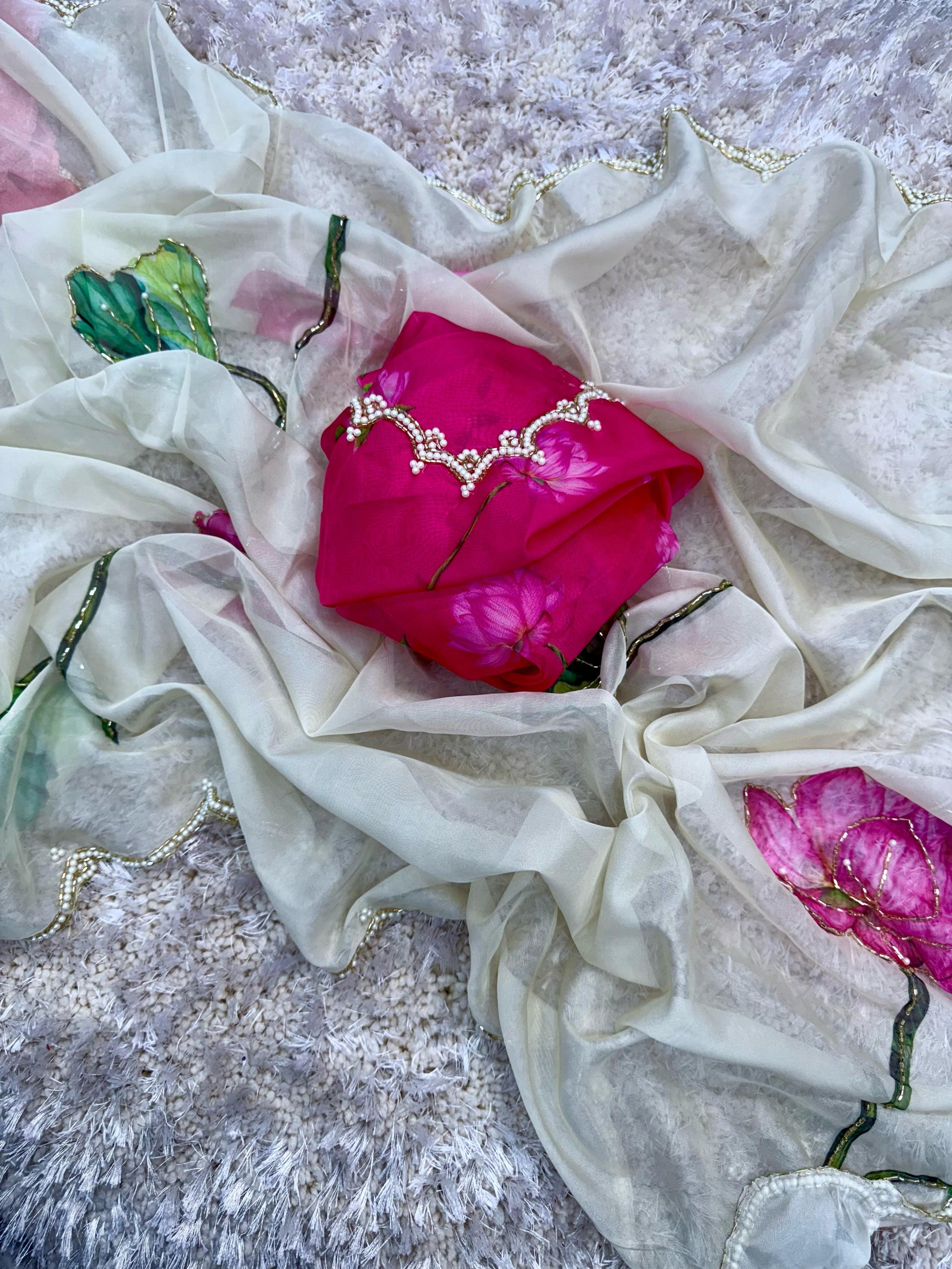Organza Tebi Silk Saree with Floral Print & Pure Handwork – Comes with Heavy Embroidered Blouse | Swaraas.in