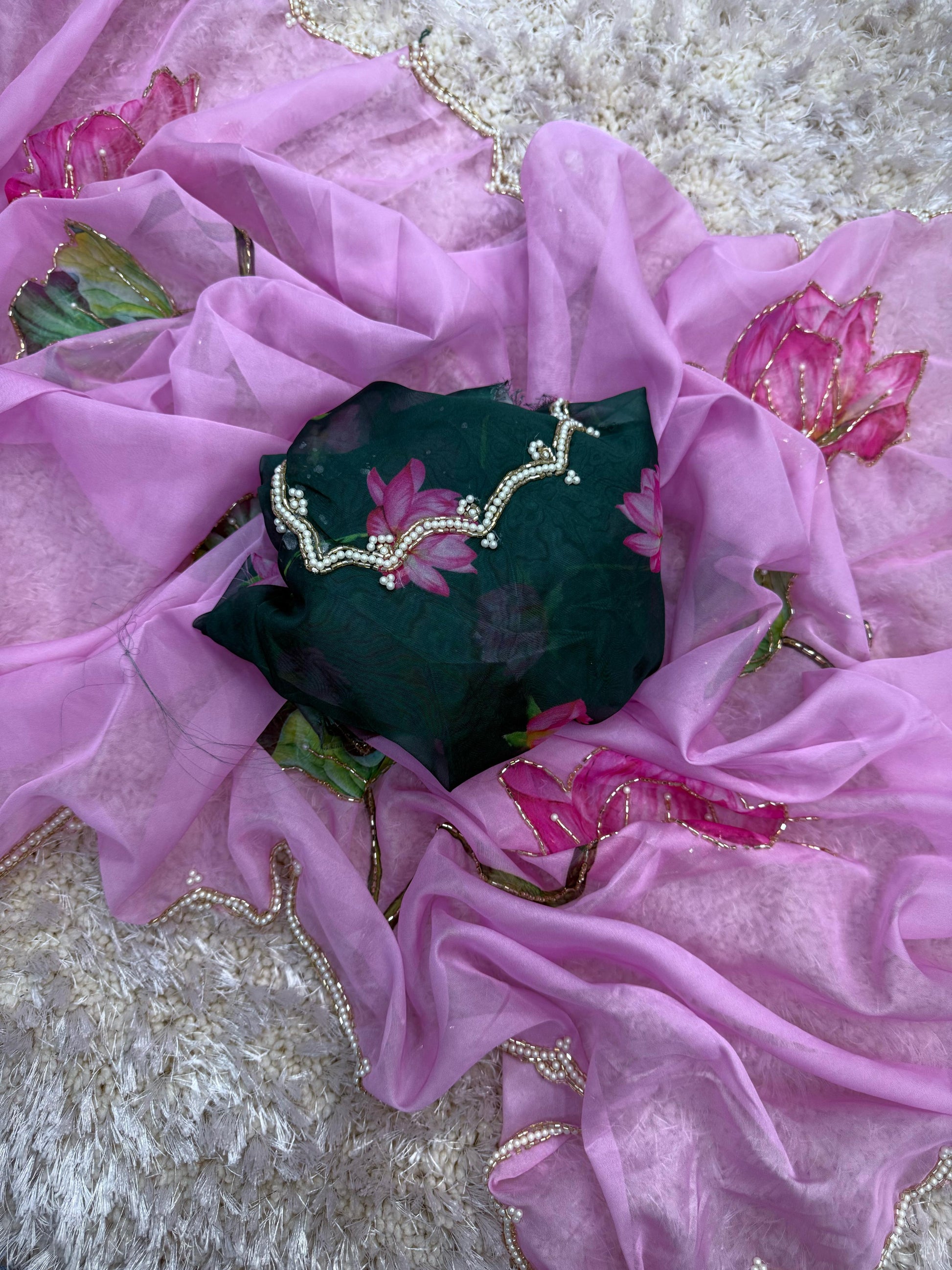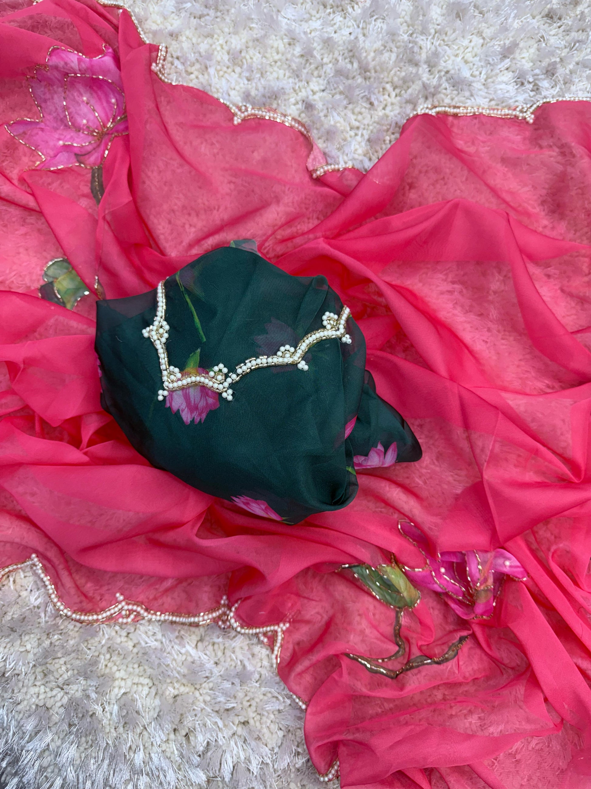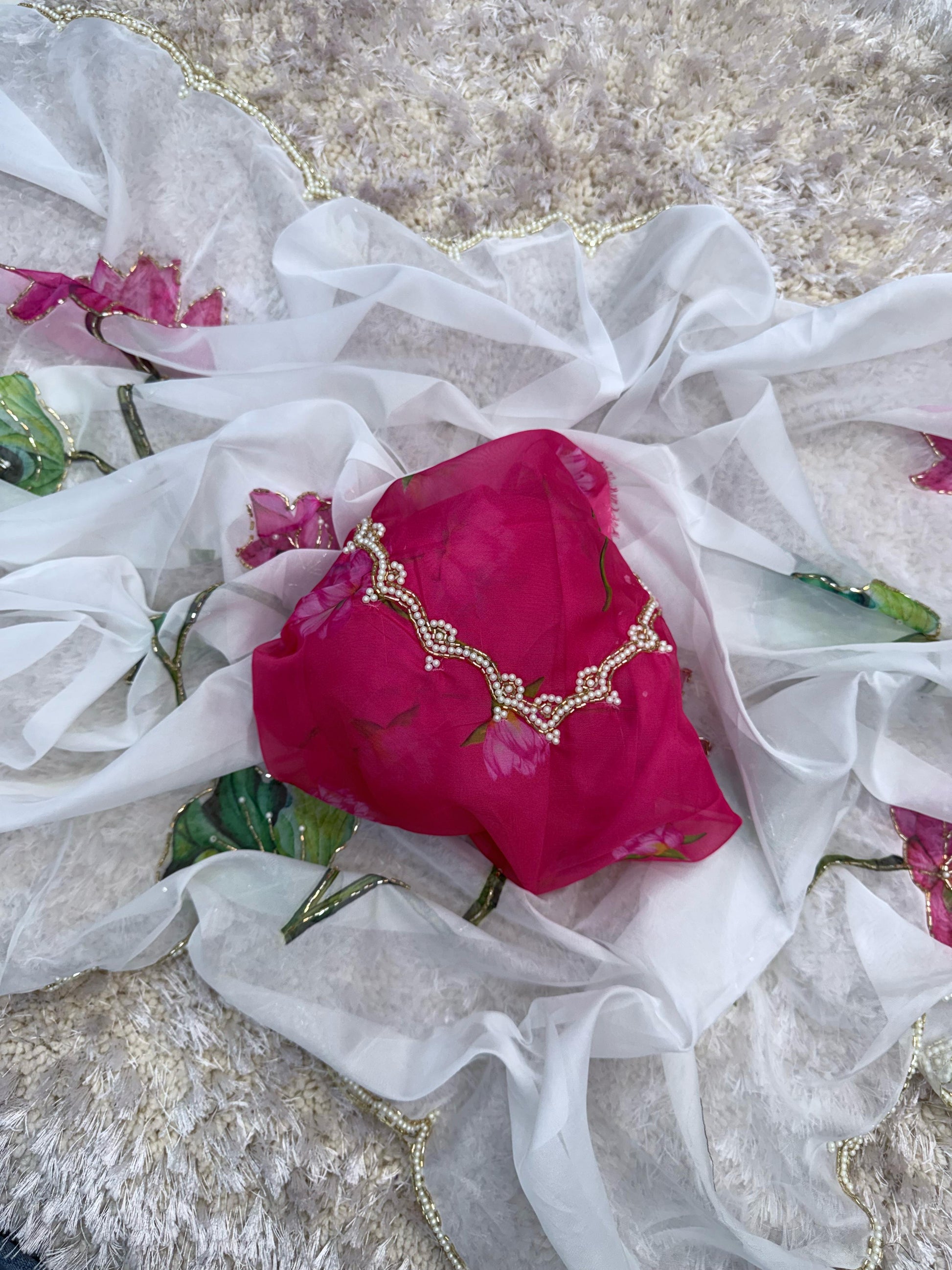 Embrace elegance with this premium Organza Tebi Silk saree, featuring soft translucency, a graceful drape, and exquisite detail. This saree is adorned with delicate floral prints and pure handwork embellishments, making it a refined choice for weddings and festive occasions.