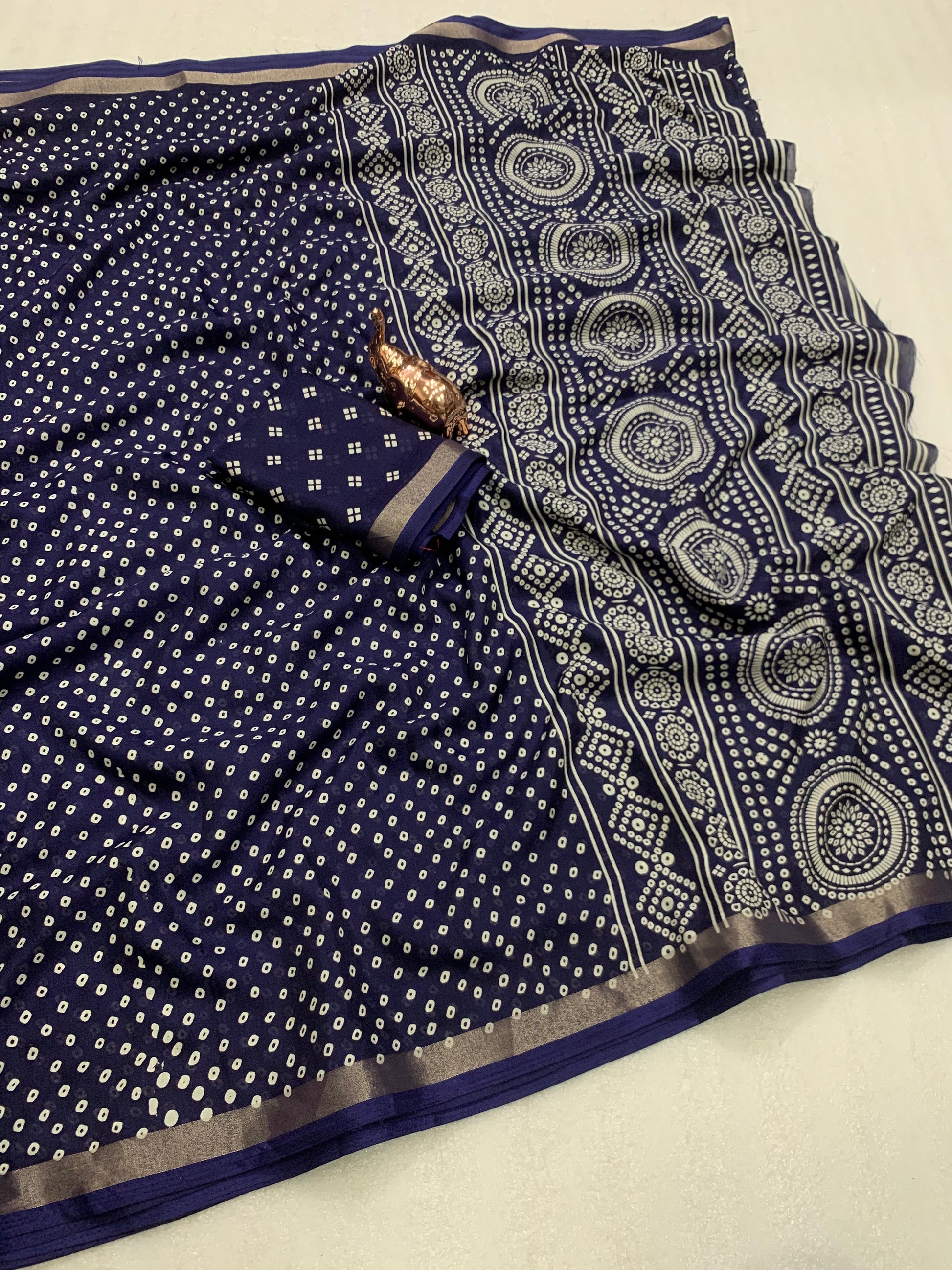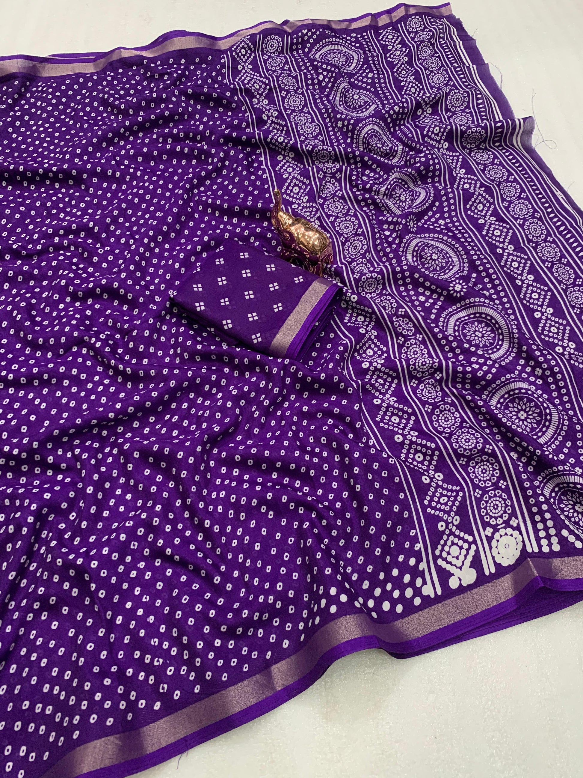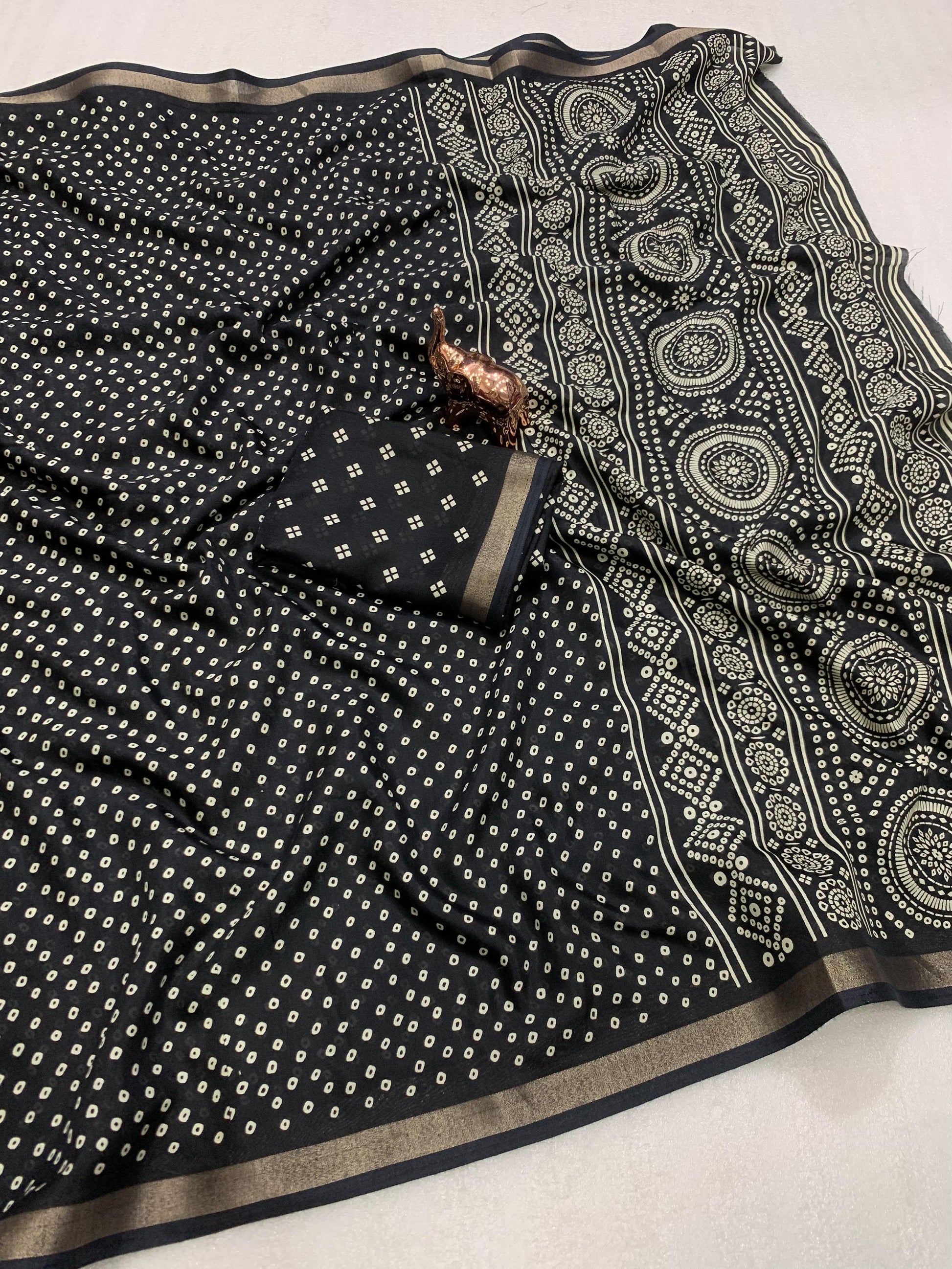 Heavy Mul Cotton Silk Saree with Bandhani Print & Golden Zari Patti Border