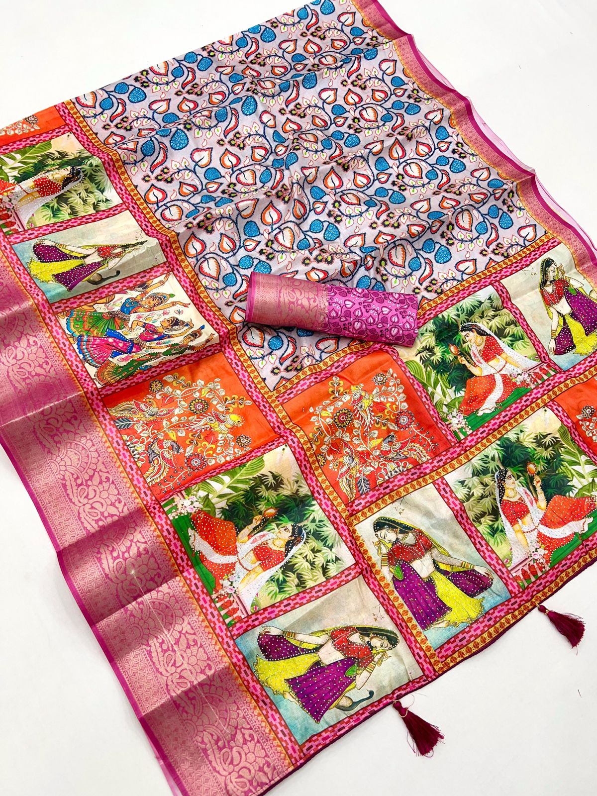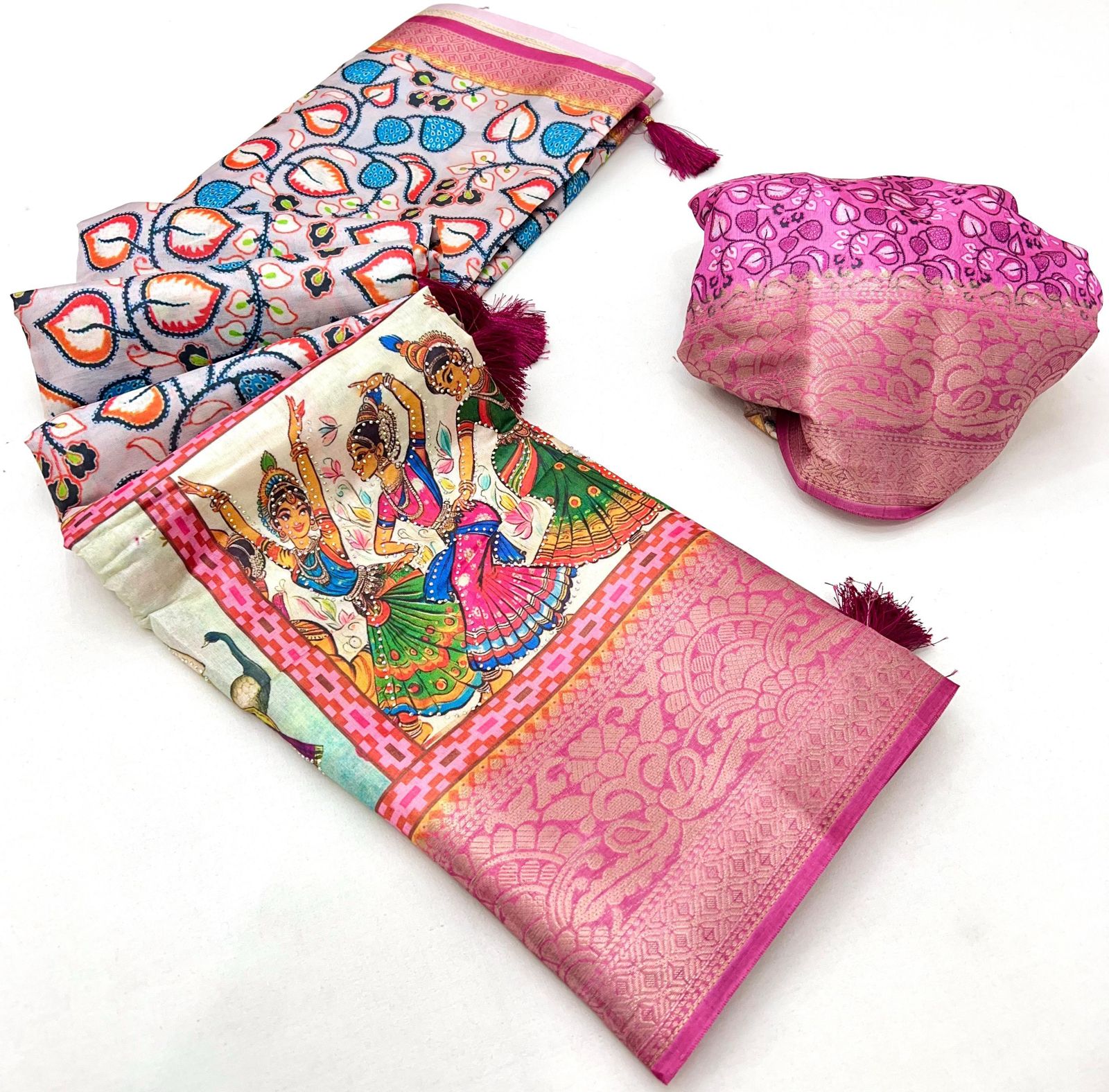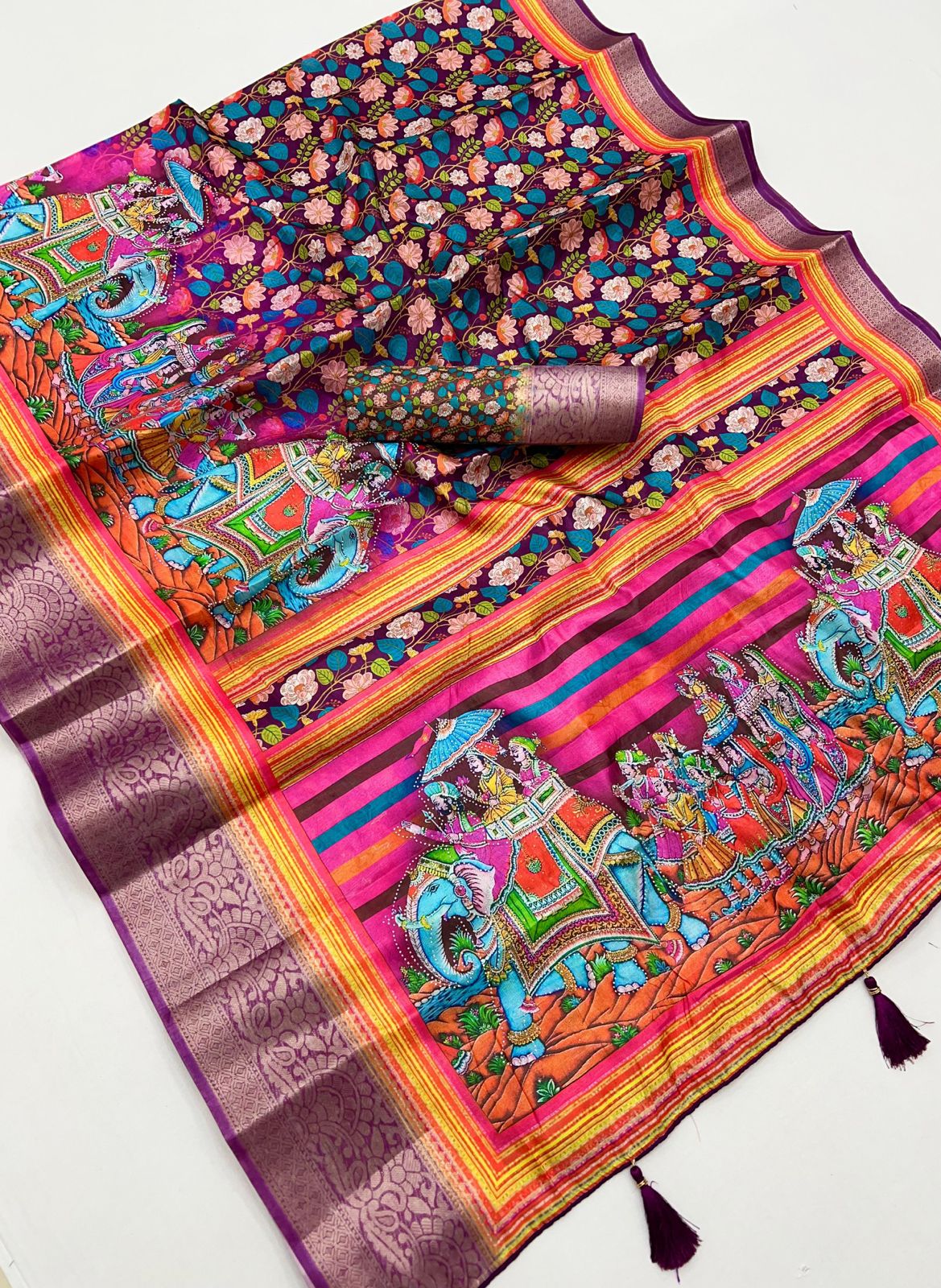 Pure Soft Dola Silk Saree with Kalamkari Print, Swarovski Stone Work & Jacquard Border | Fancy Tassels Pallu