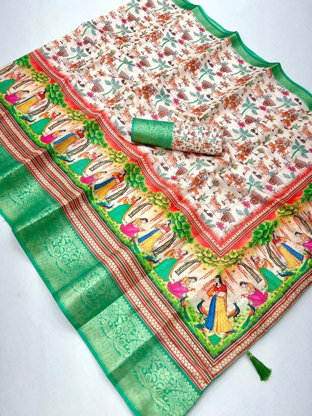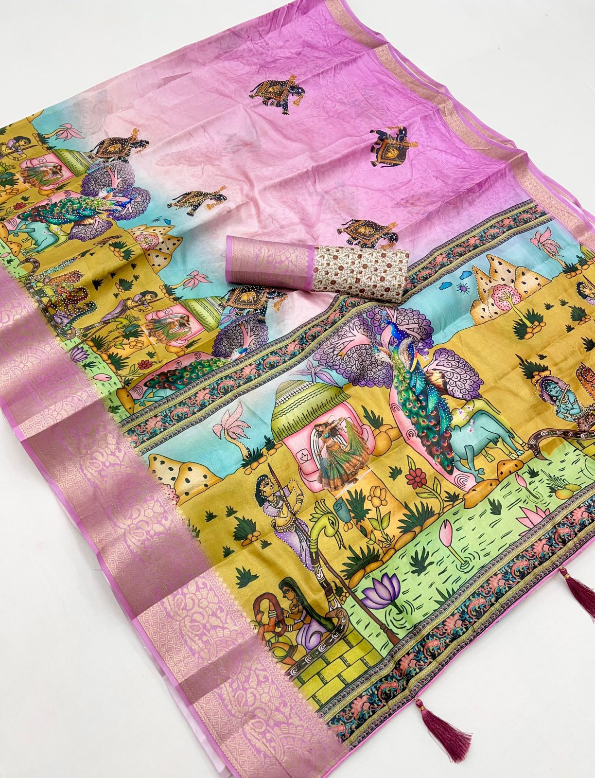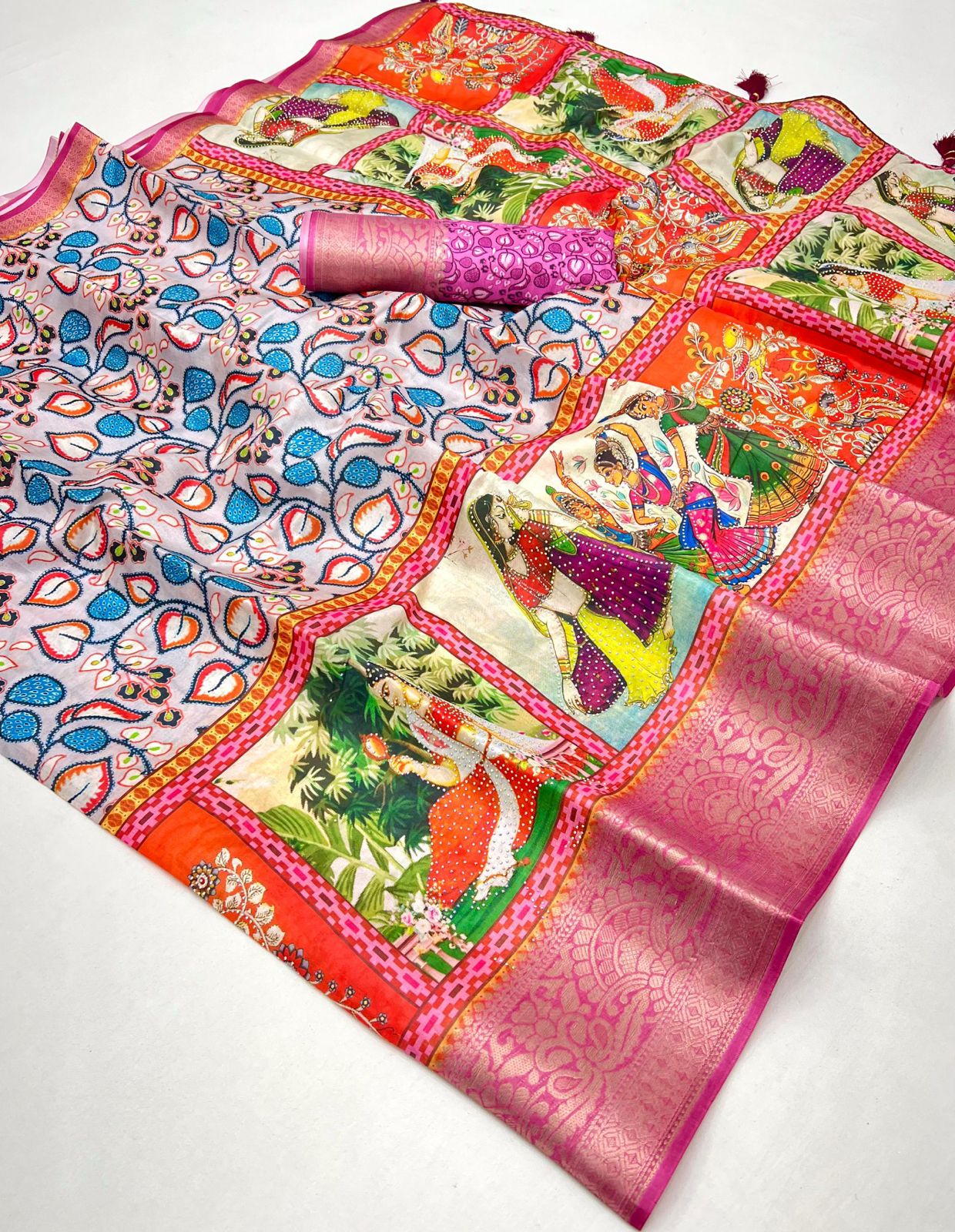 Pure Soft Dola Silk Saree with Kalamkari Print, Swarovski Stone Work & Jacquard Border | Fancy Tassels Pallu