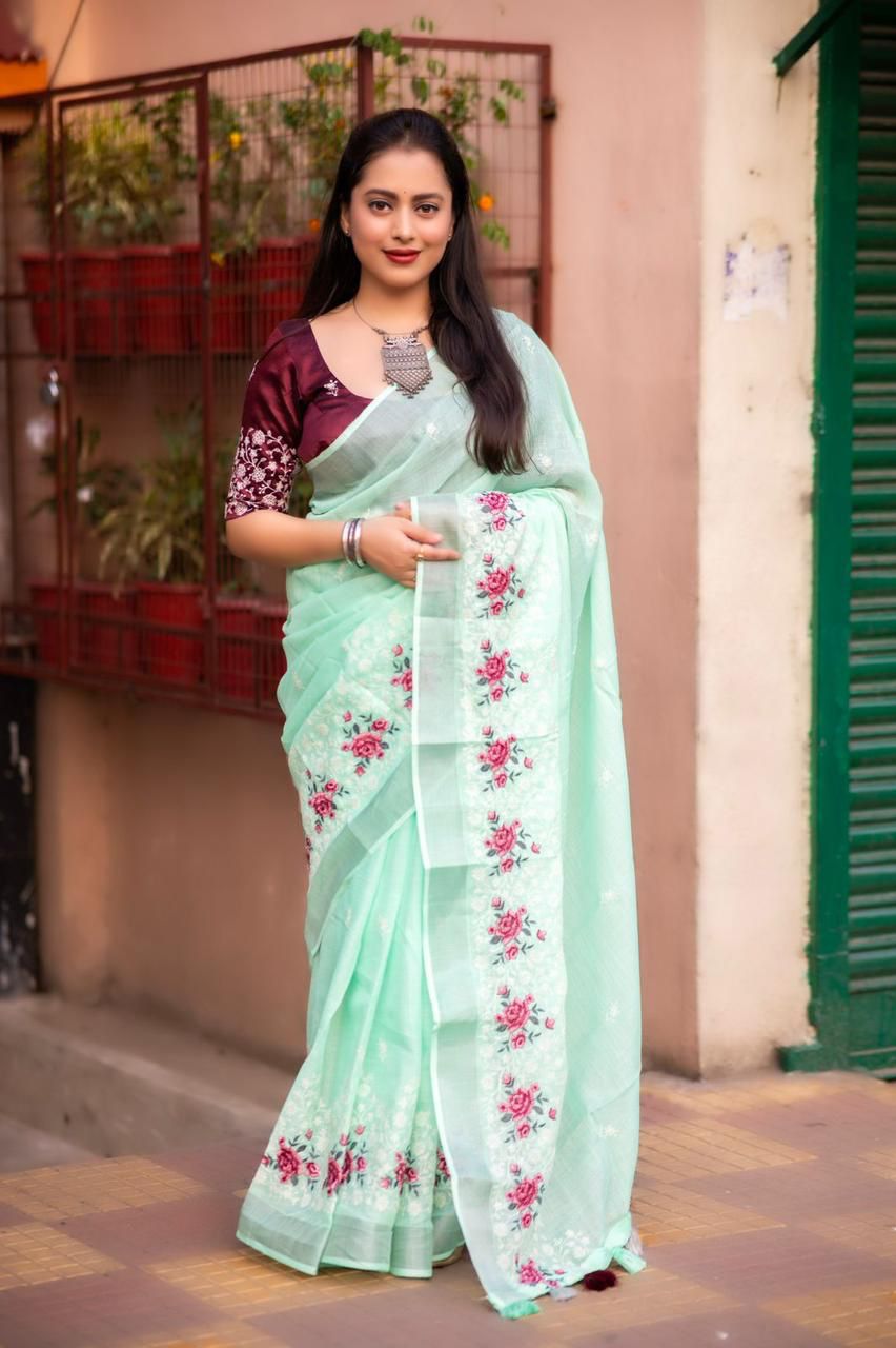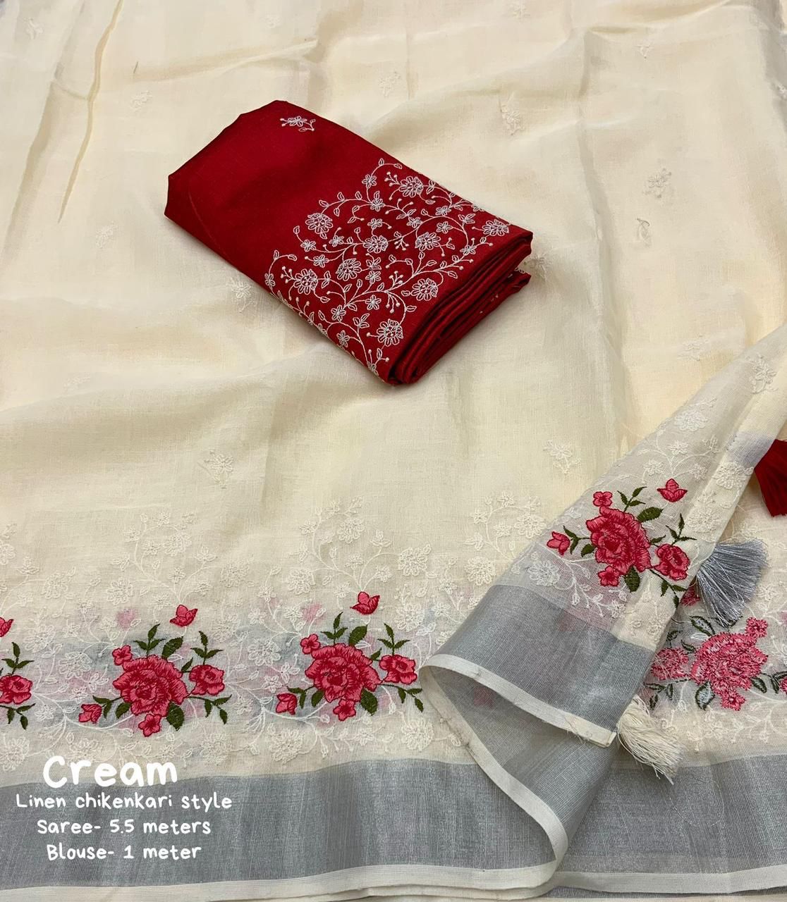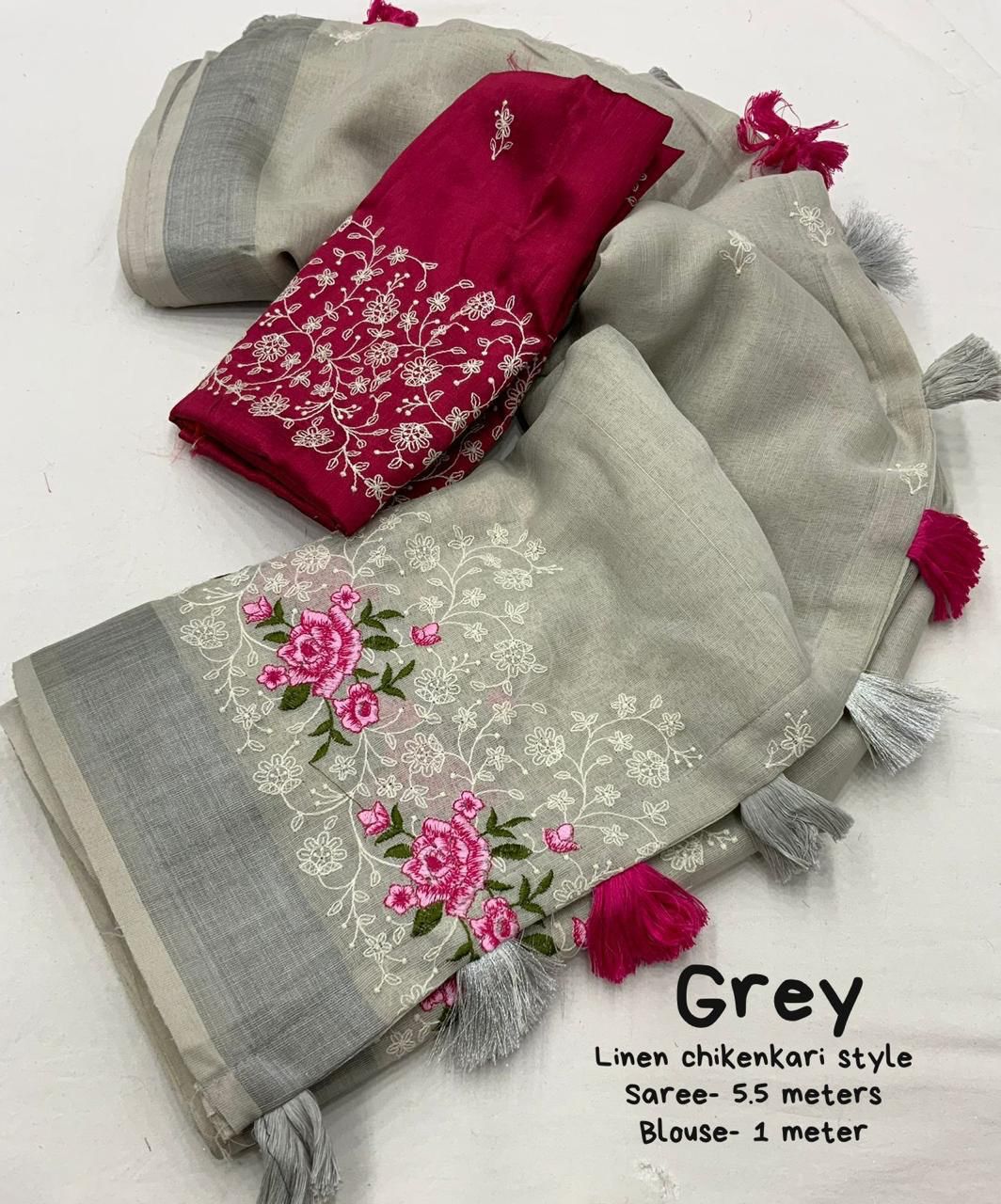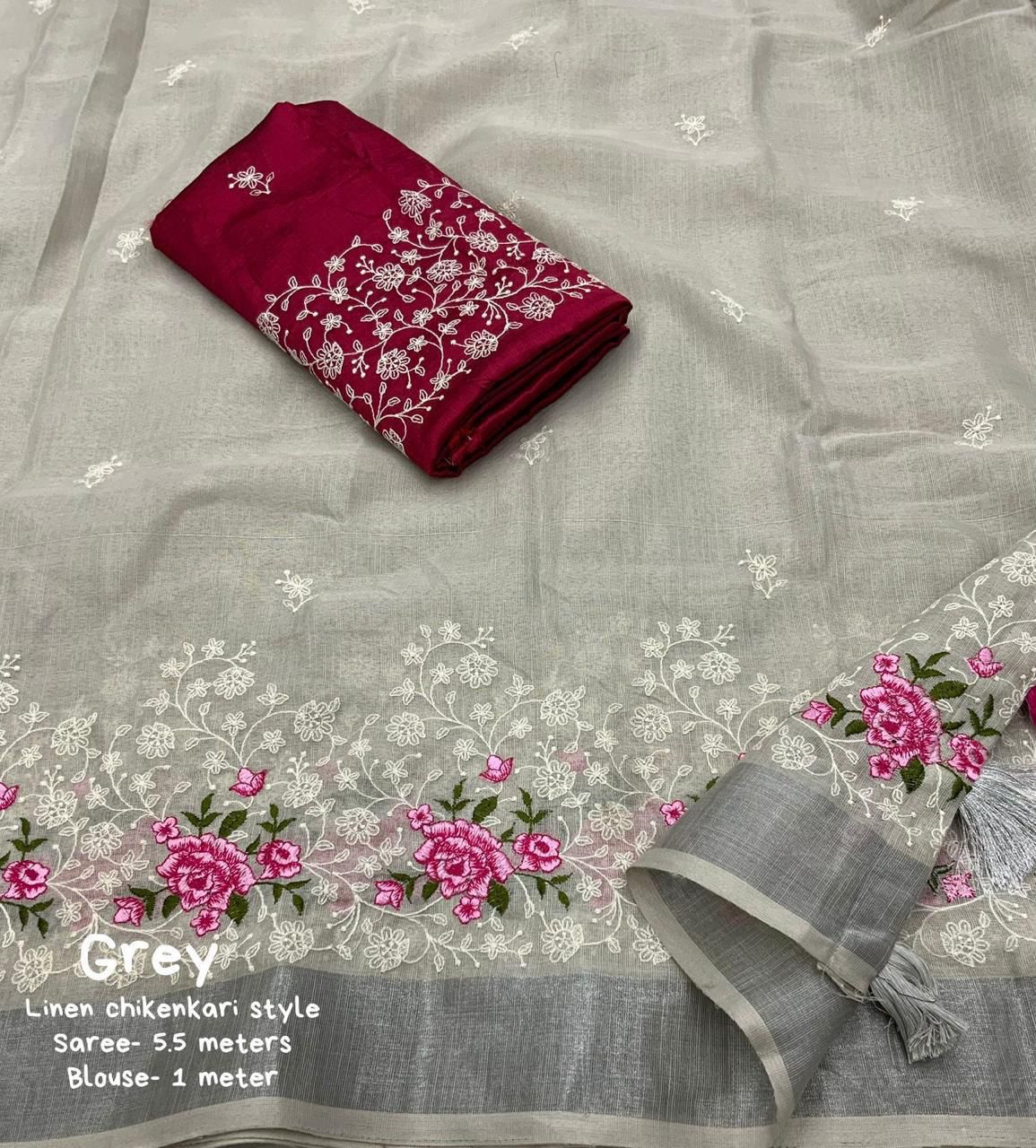Pure Linen Saree with Elegant Silver Zari Pattu Border & Matching Blouse – Handloom-Inspired Ethnic Wear | Swaraas.in