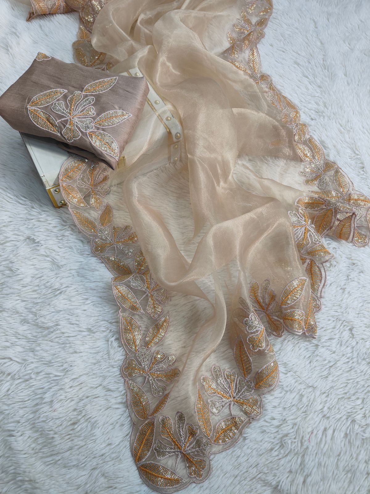 Sindhur Pure Organza Silk Saree with 3mm Sequin Embroidery & Designer Arco Cut Border – With Embroidered Satin Blouse