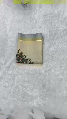 Soft Gold Banarasi Tissue Saree with Intricate Zari & Thread Peacock Design