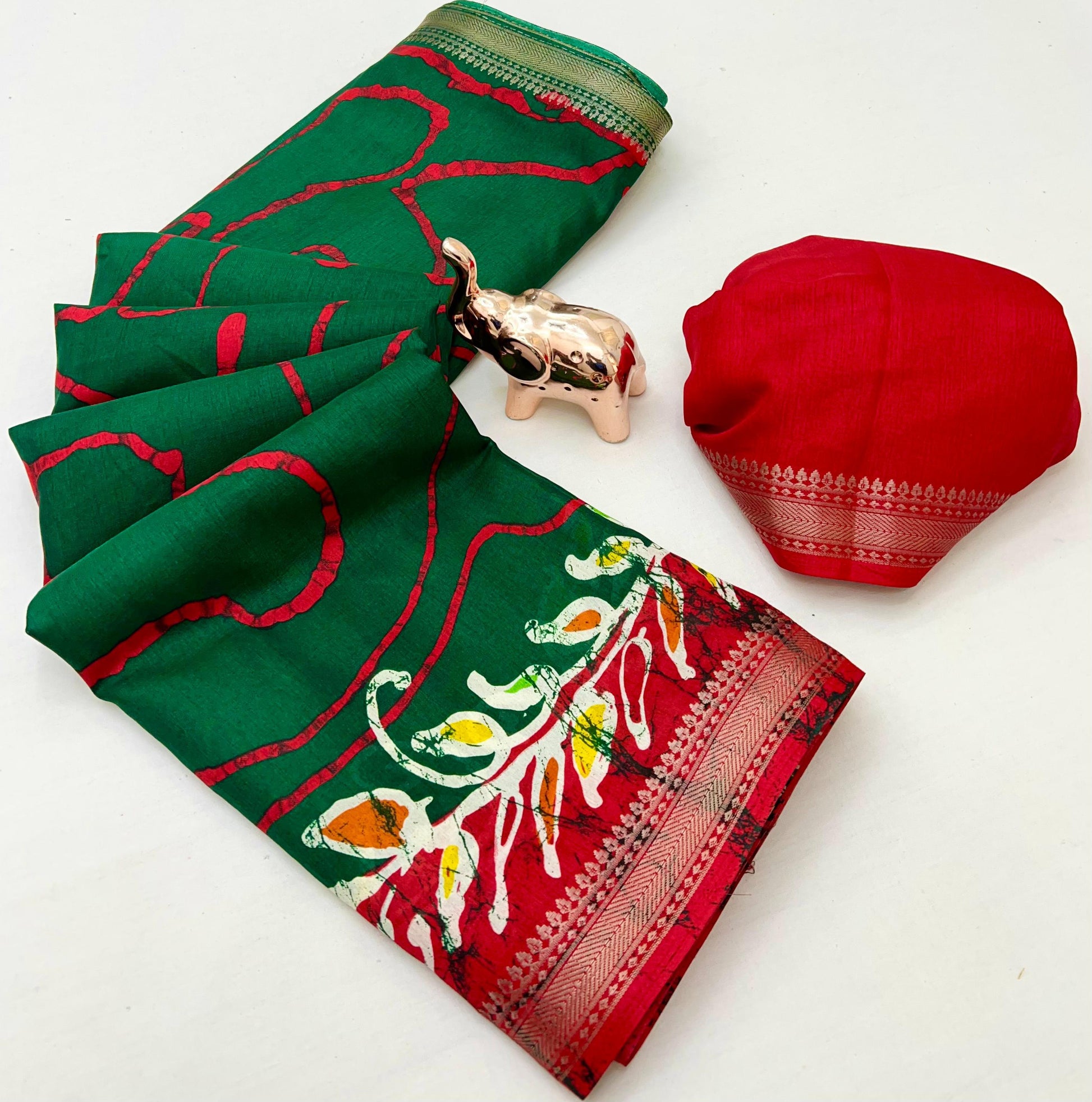 Soft poly silk Saree with Kalamkari Prints & Contrast Zari Border – With Running Blouse