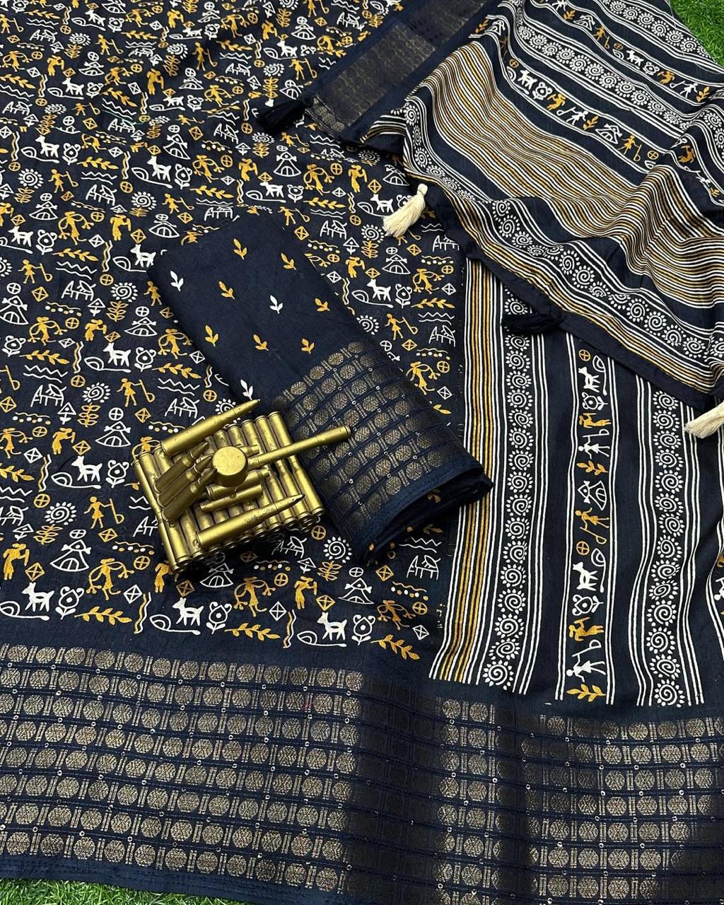Soft Dola Silk Kalamkari Print Saree with Sequin & Zari Border | Printed Blouse – Swaraas