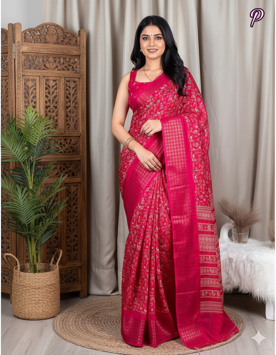 Saree Fabric: Luxuriously soft Dola silk – smooth, breathable, and rich in drape