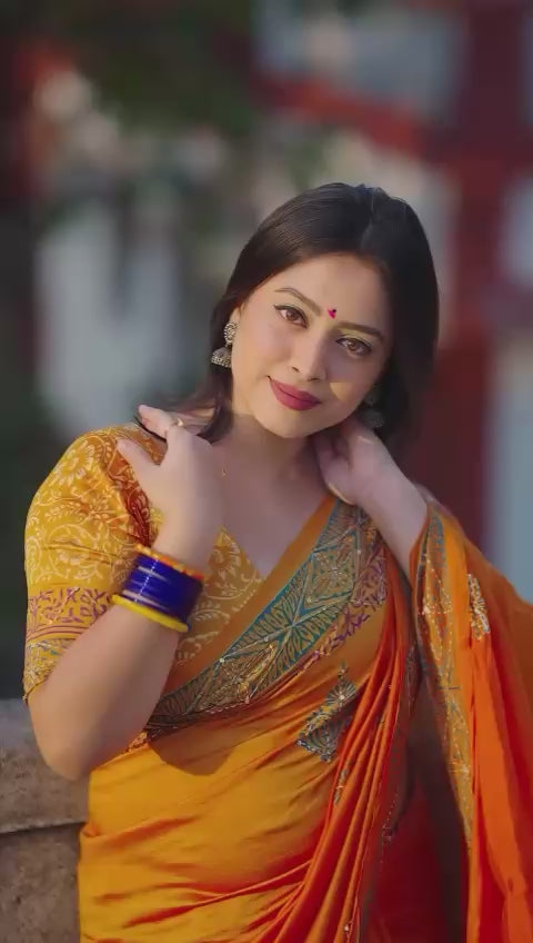 Premium Turmeric Yellow Ajrakh Hand Block Printed Chanderi Cotton Saree with Kaatha & Sequin Work | Swaraas.in