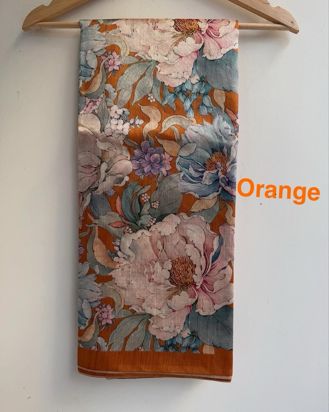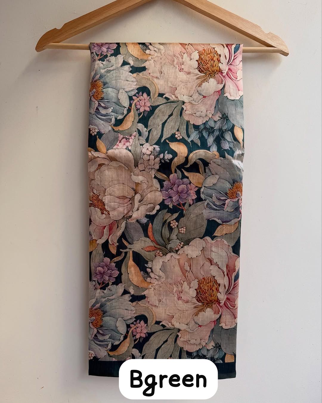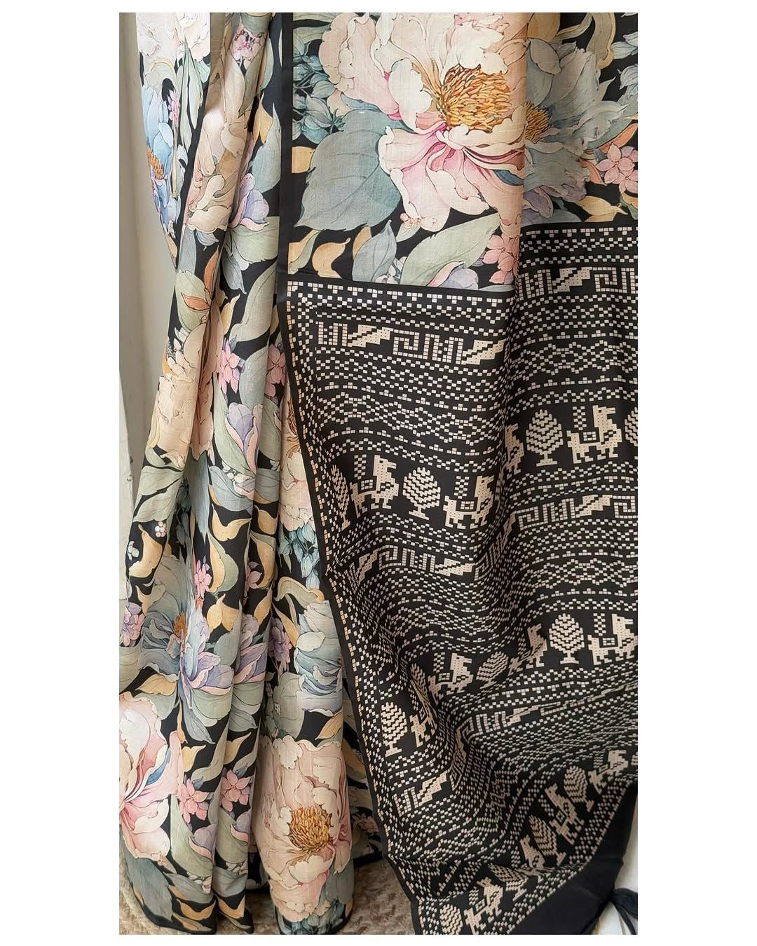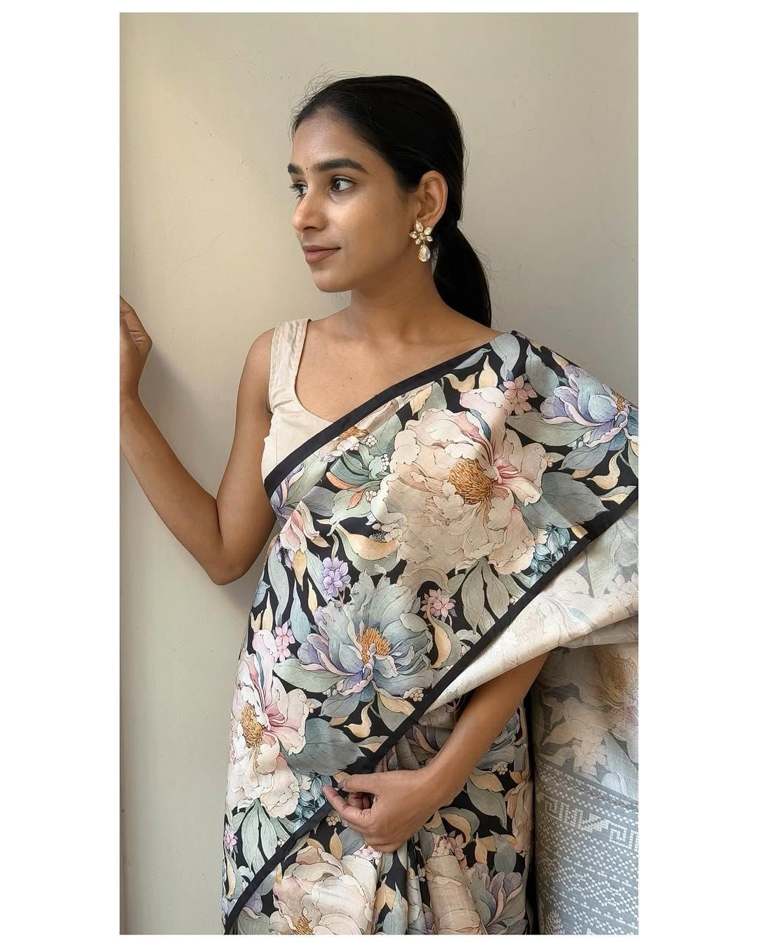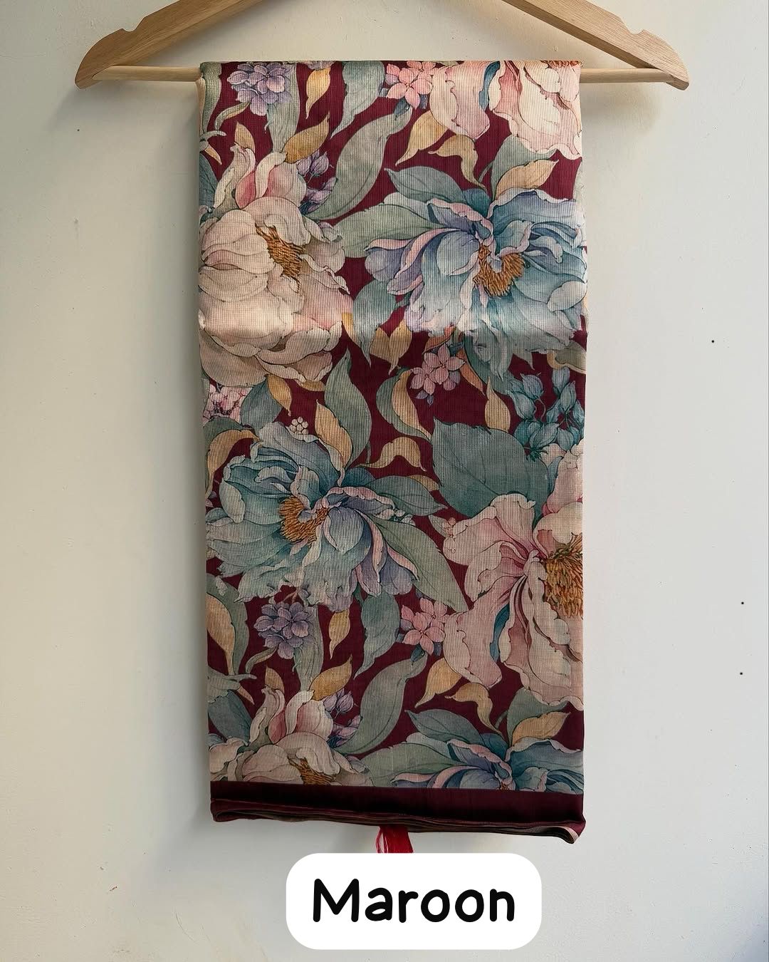 Soft Tussar Silk Saree with 3D Floral Print & Tassel Pallu – Swaraas.in