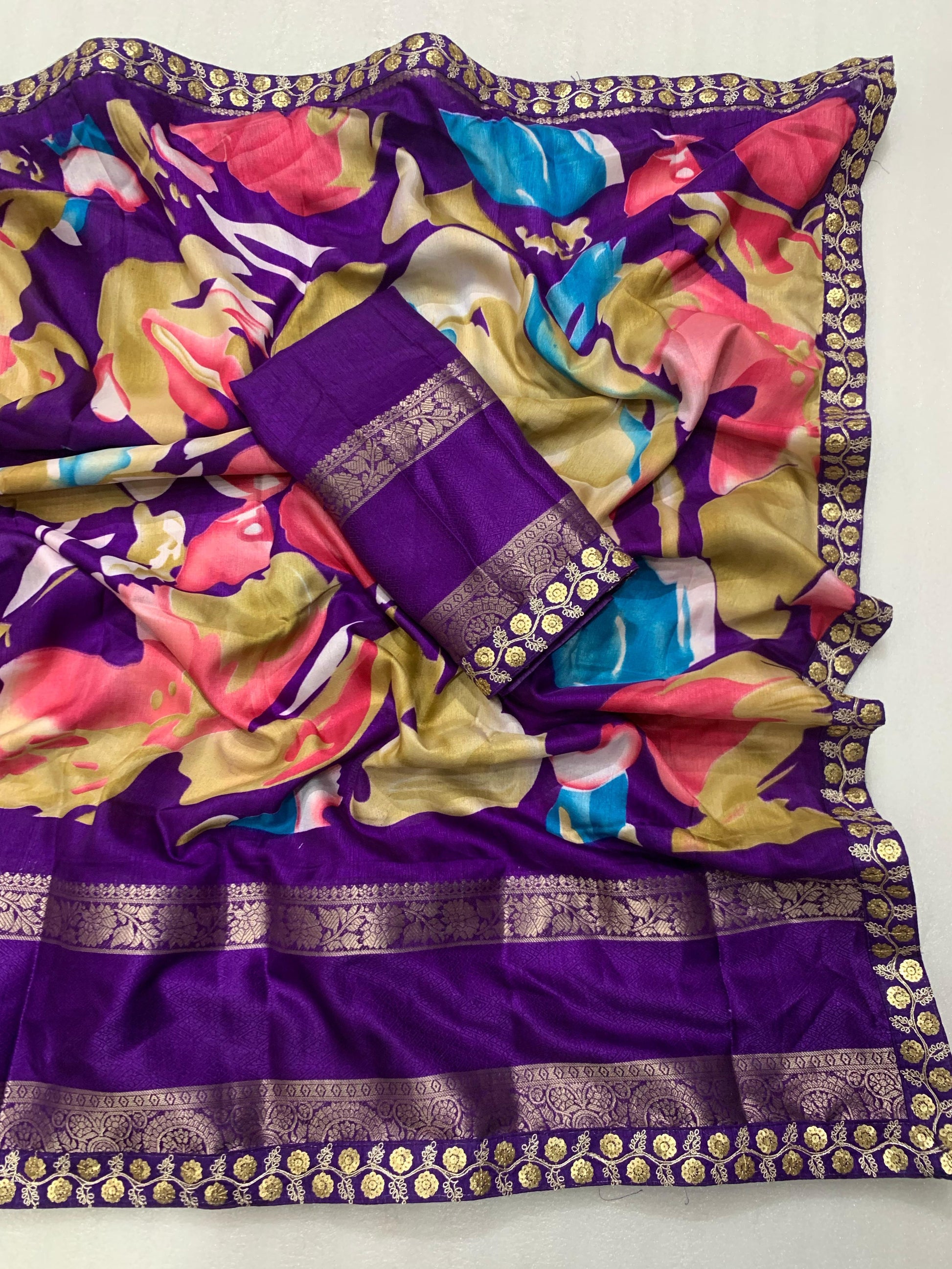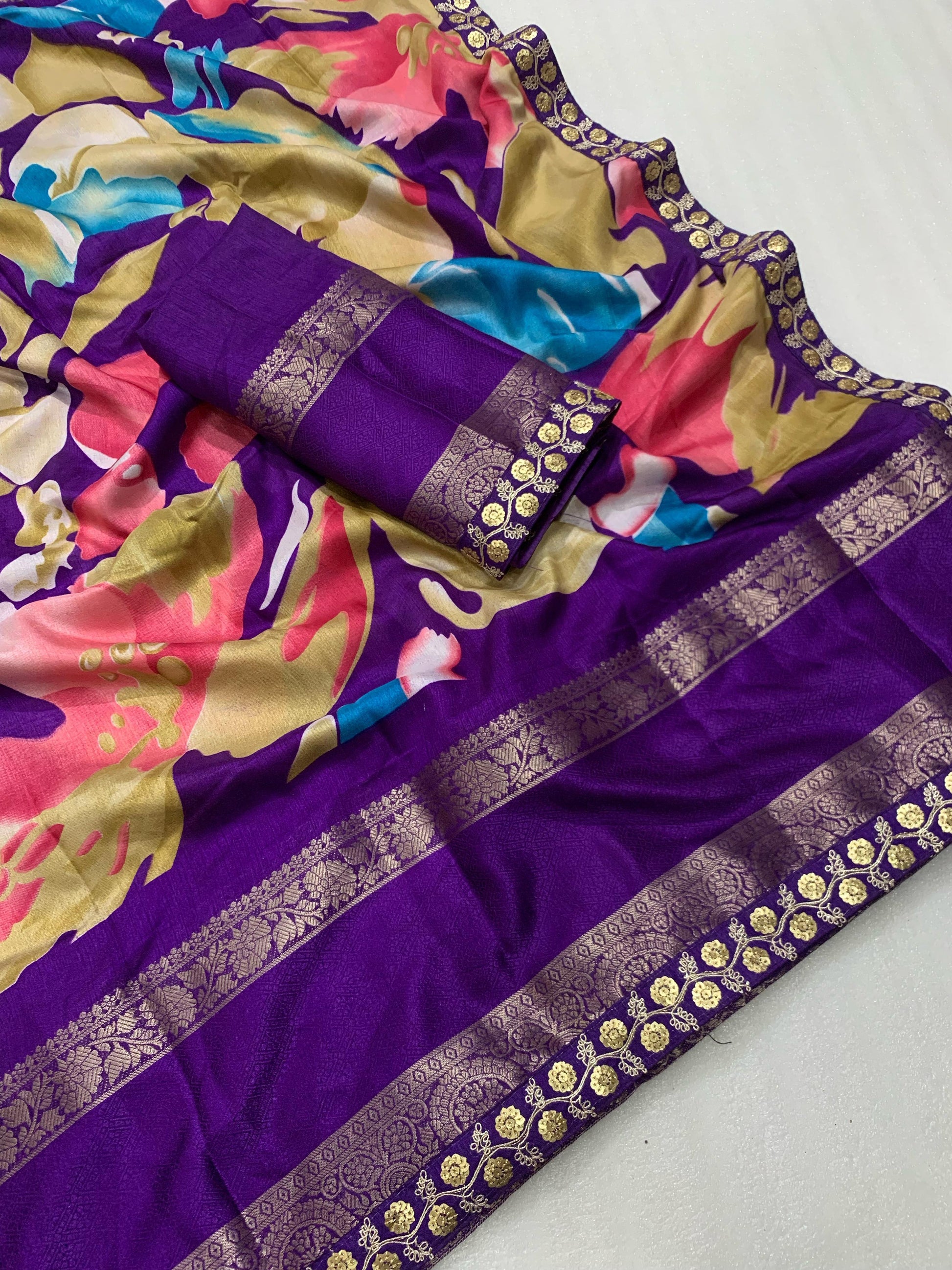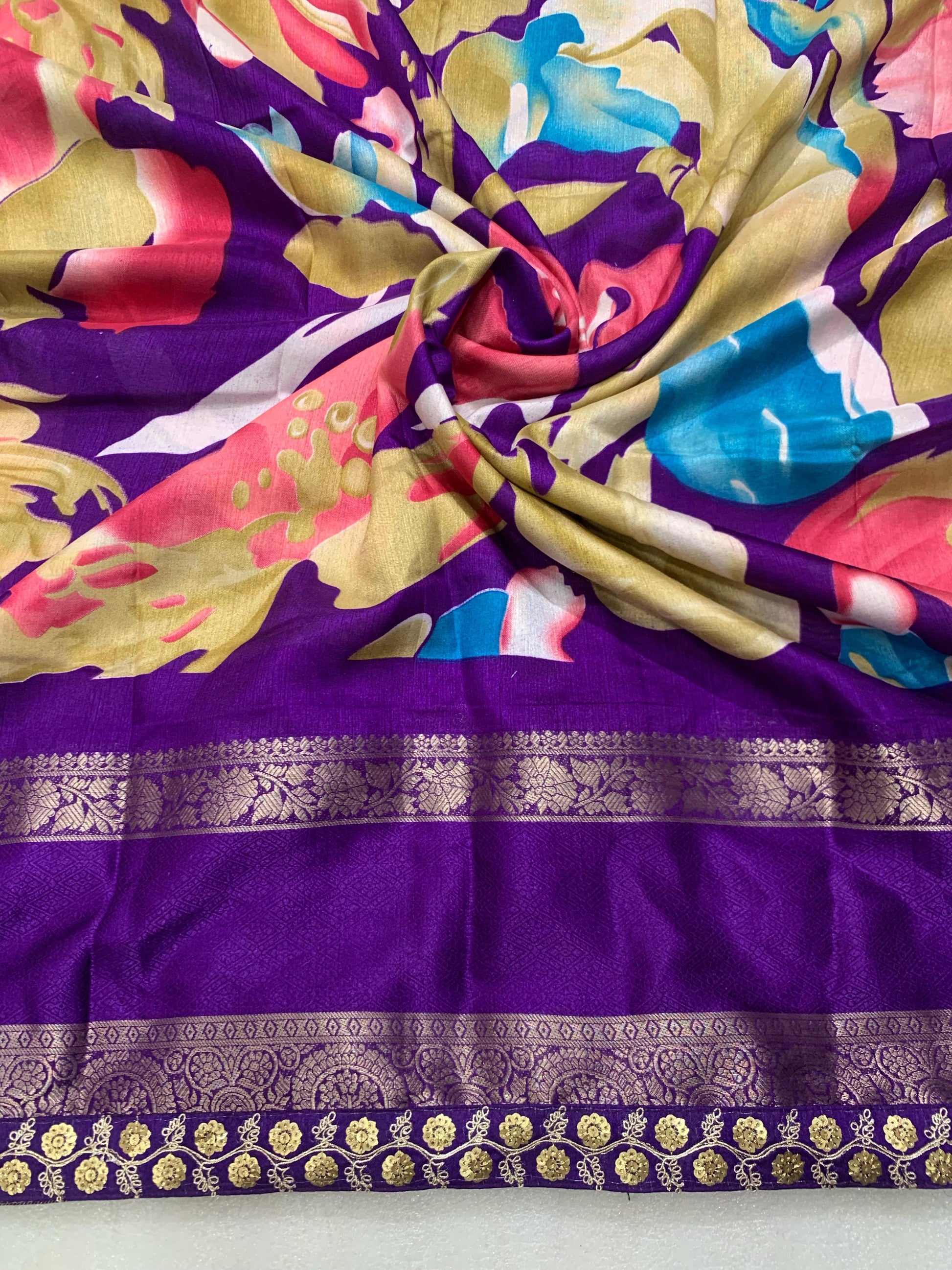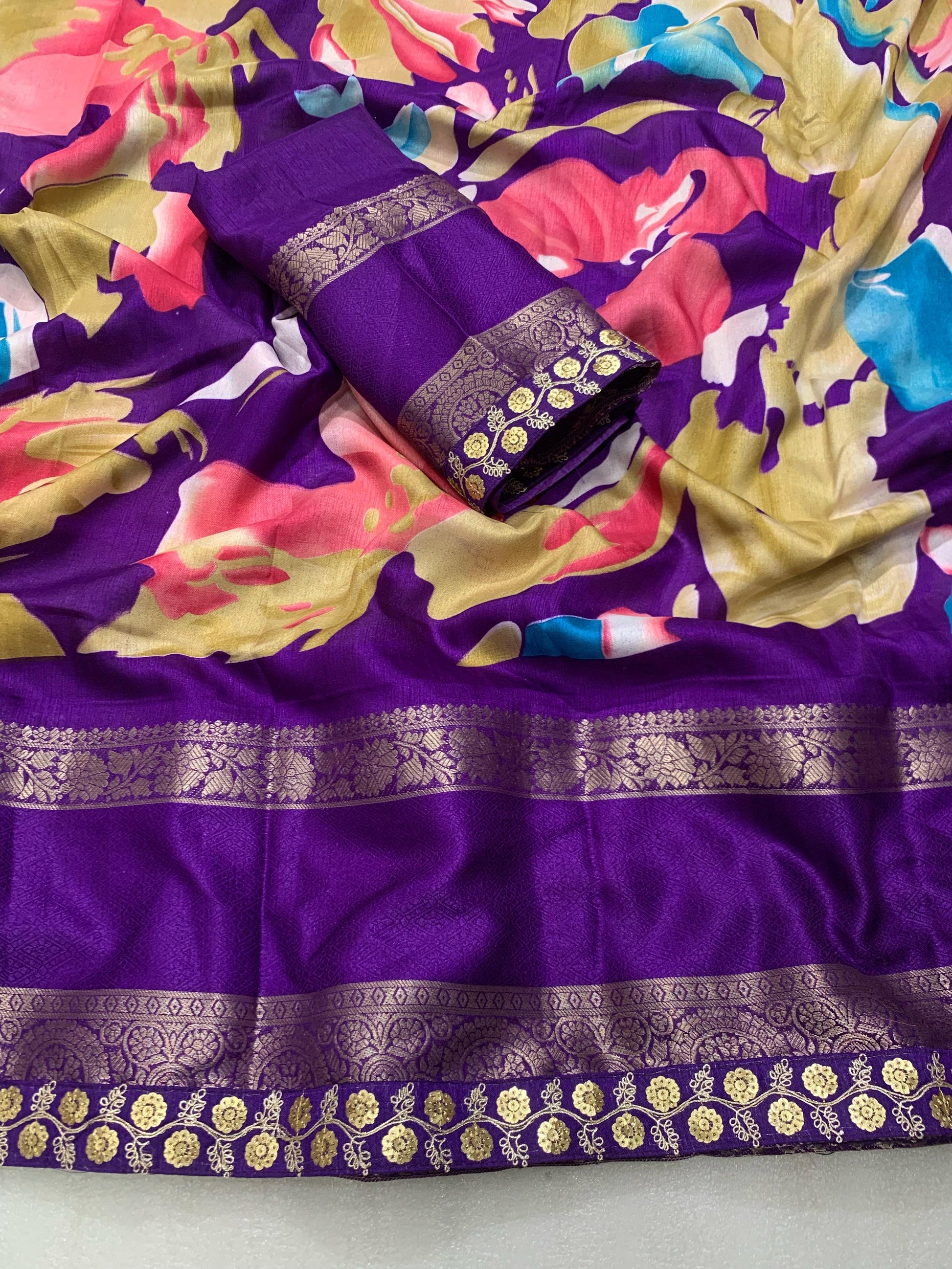 Soft Dolla Crepe Silk Saree with Floral Digital Print, Magam & Embroidery Work, and 9-Inch Jacquard Border | Swaraas.in