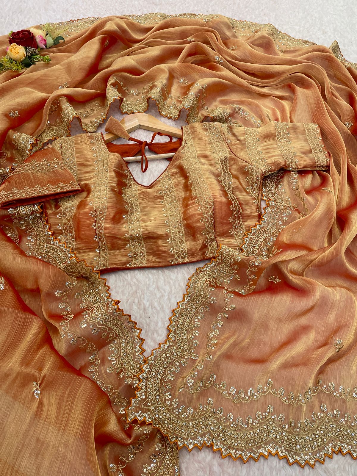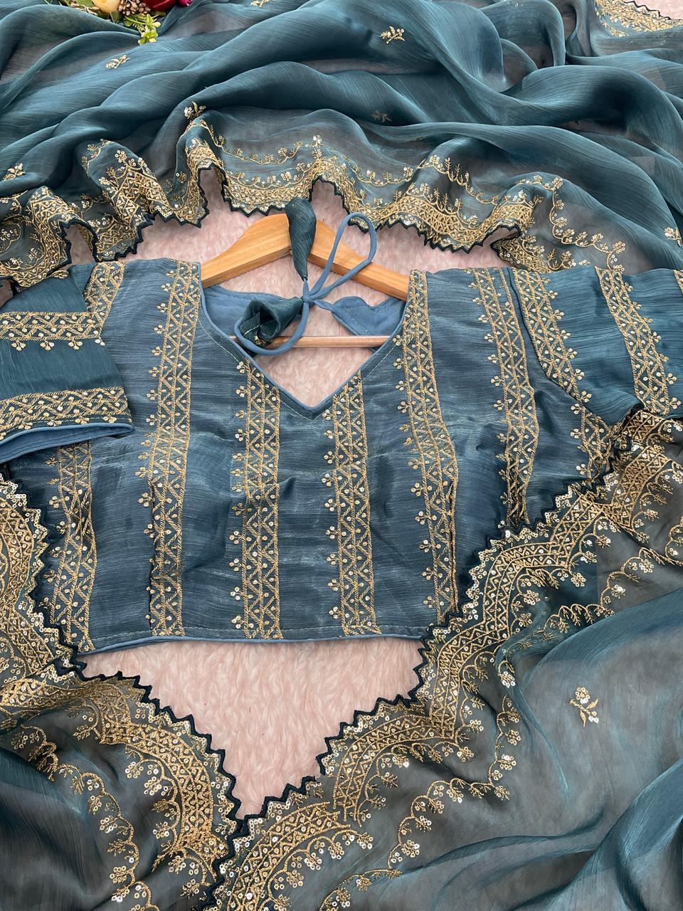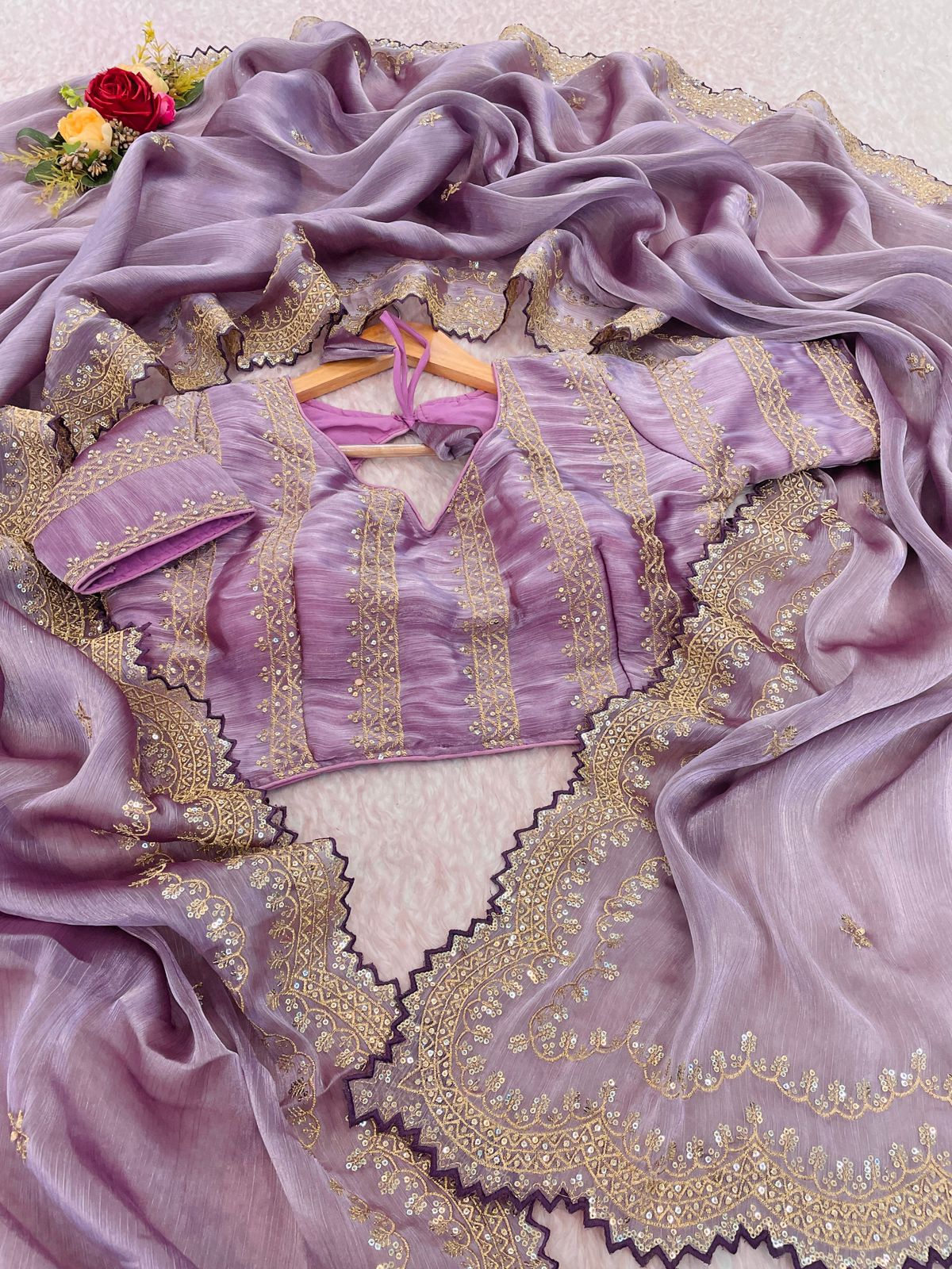 This saree is paired with a matching Barbary silk blouse, featuring all-over embroidery work, adding depth and elegance to the overall ensemble. The blouse is unstiched, allowing you to tailor it to your perfect fit.