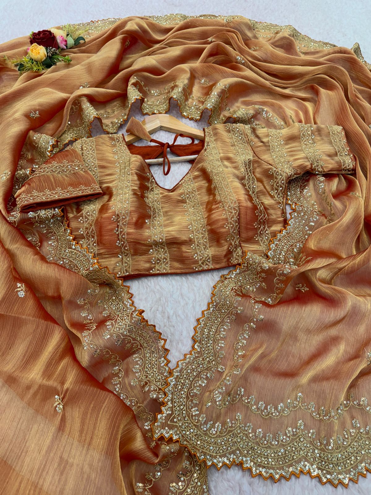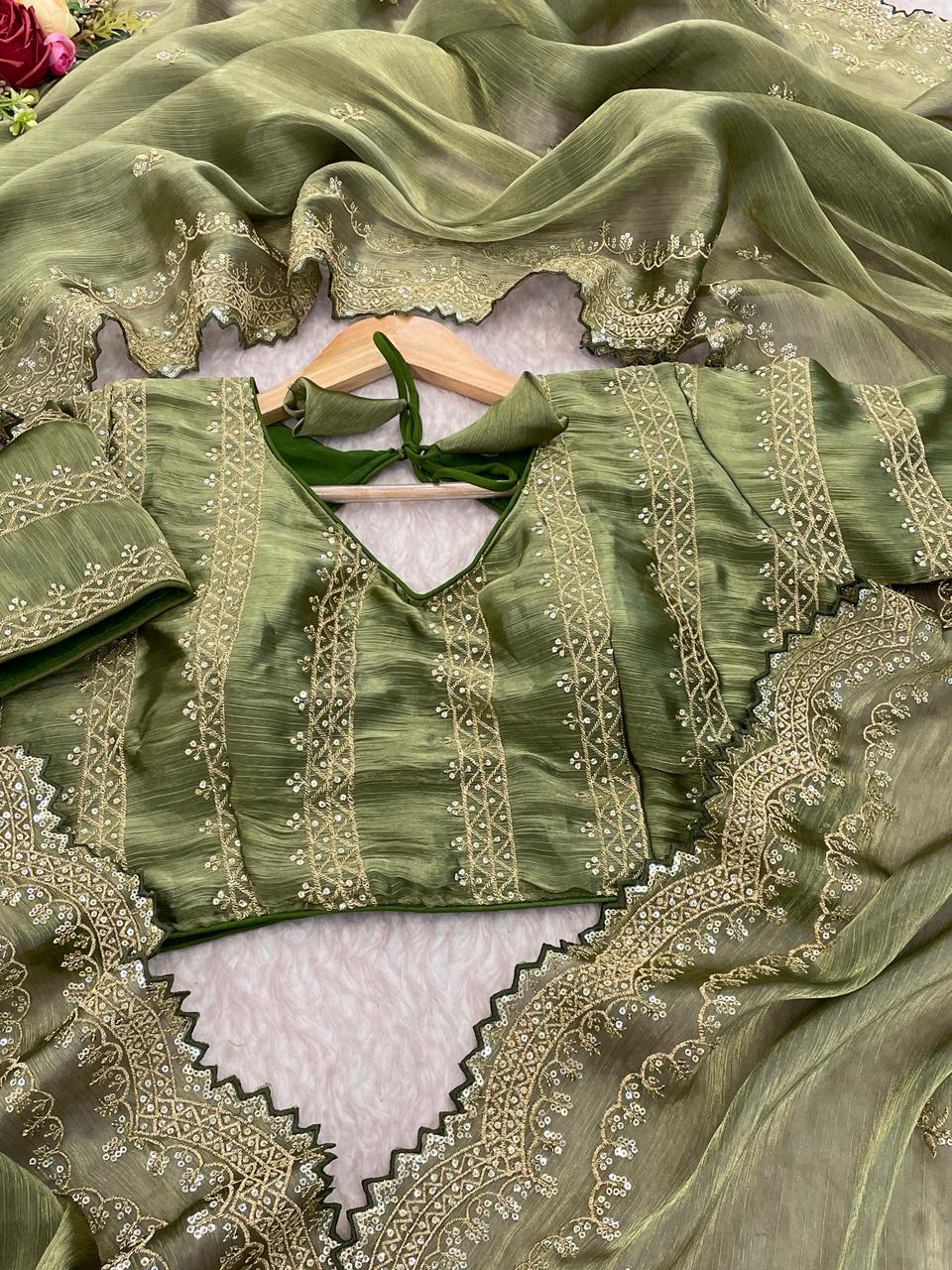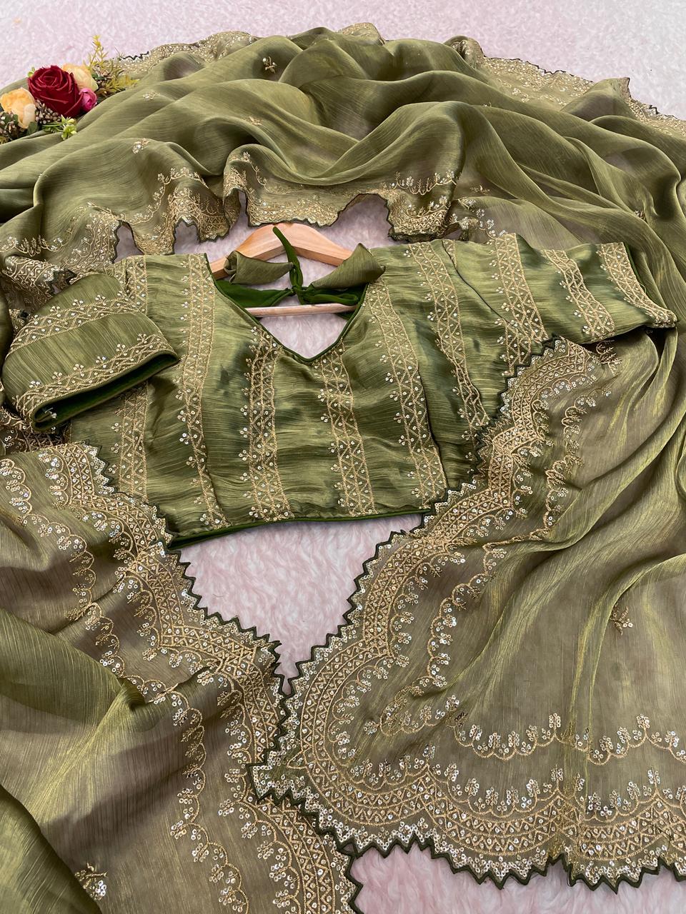 This saree is paired with a matching Barbary silk blouse, featuring all-over embroidery work, adding depth and elegance to the overall ensemble. The blouse is unstiched, allowing you to tailor it to your perfect fit.