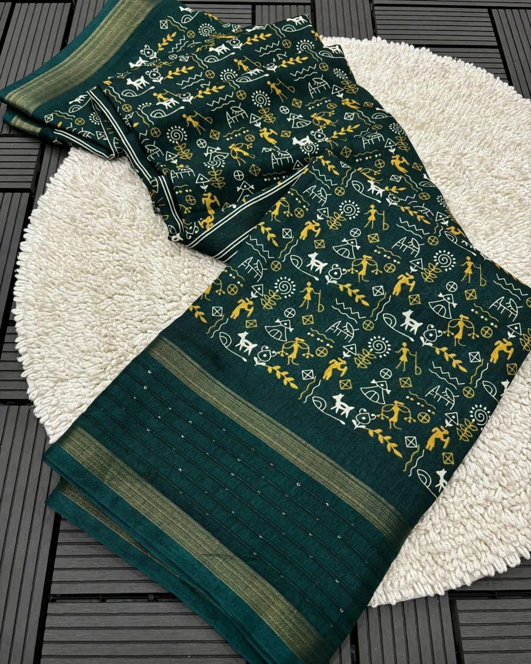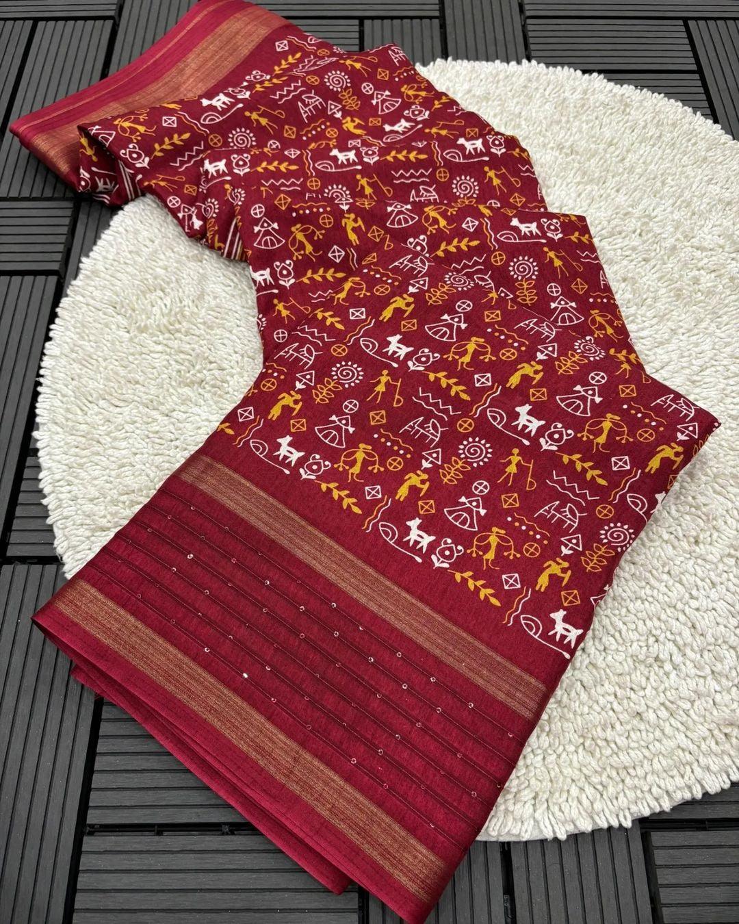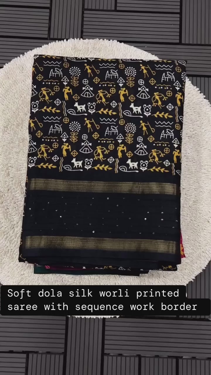 Soft Dola Silk Kalamkari Saree with Worli Print & Sequin Border | Printed Blouse – Swaraas
