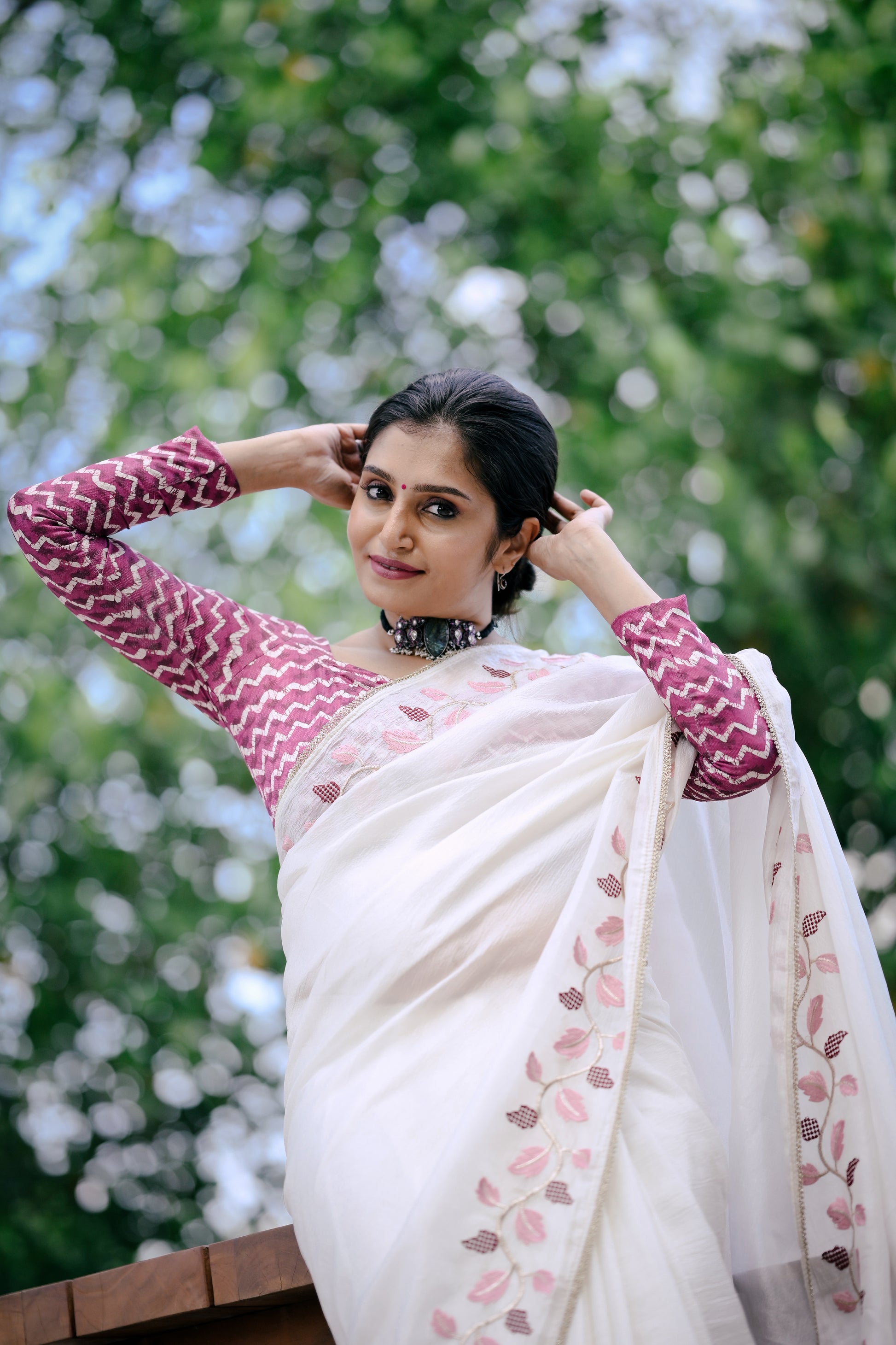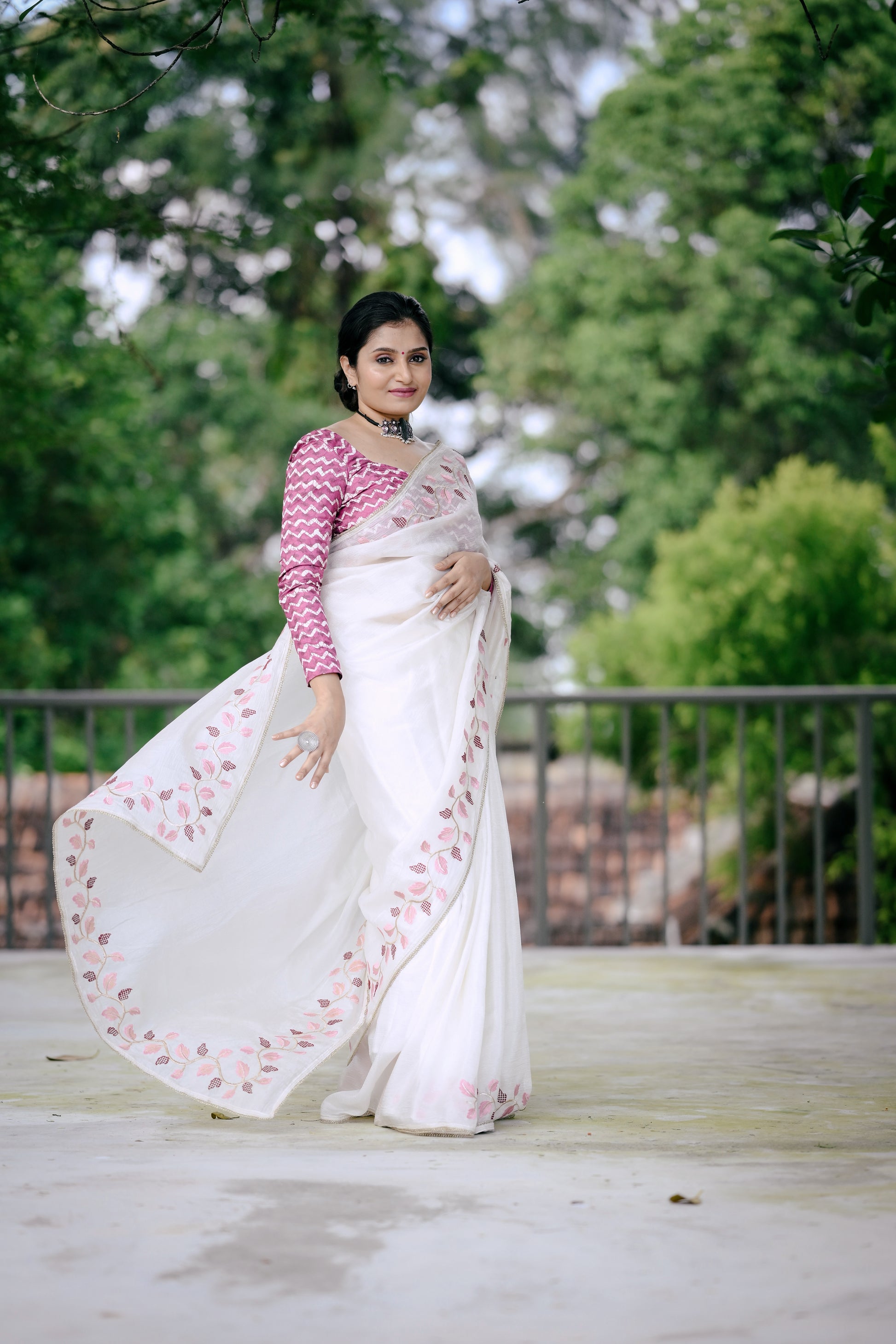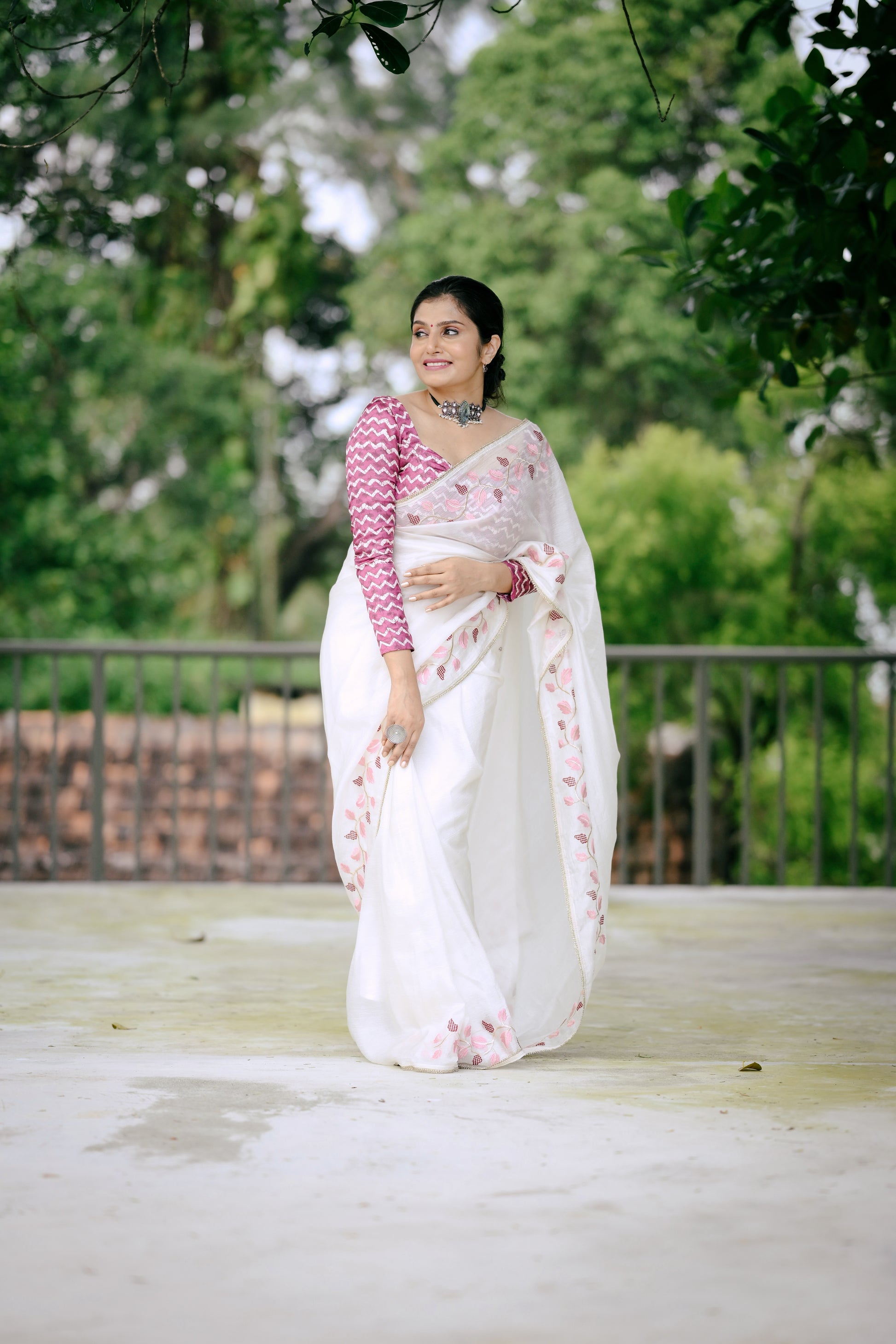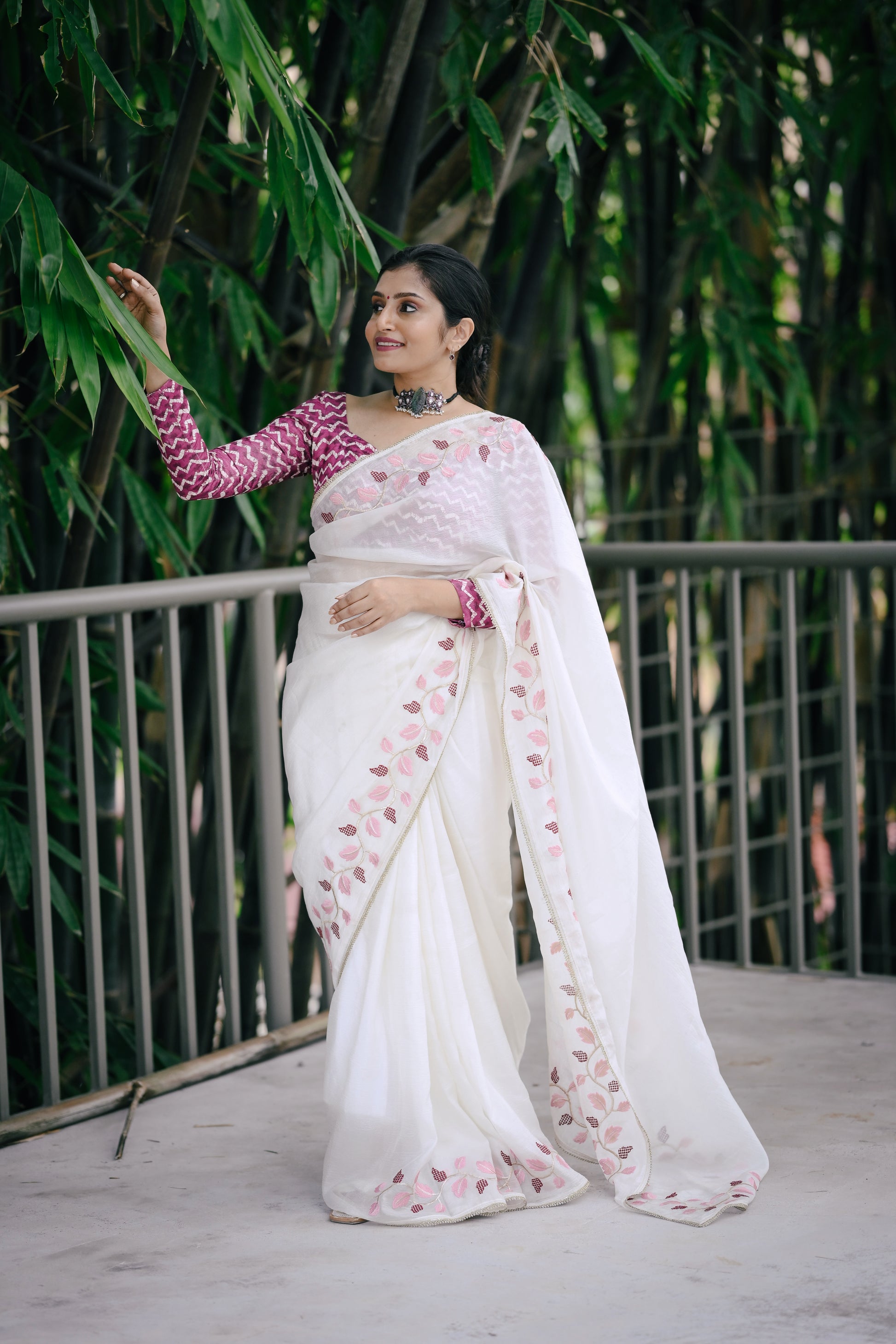 Premium Crushed Georgette Designer Saree in White Leaf Edition with Batik Print Crape Silk Blouse