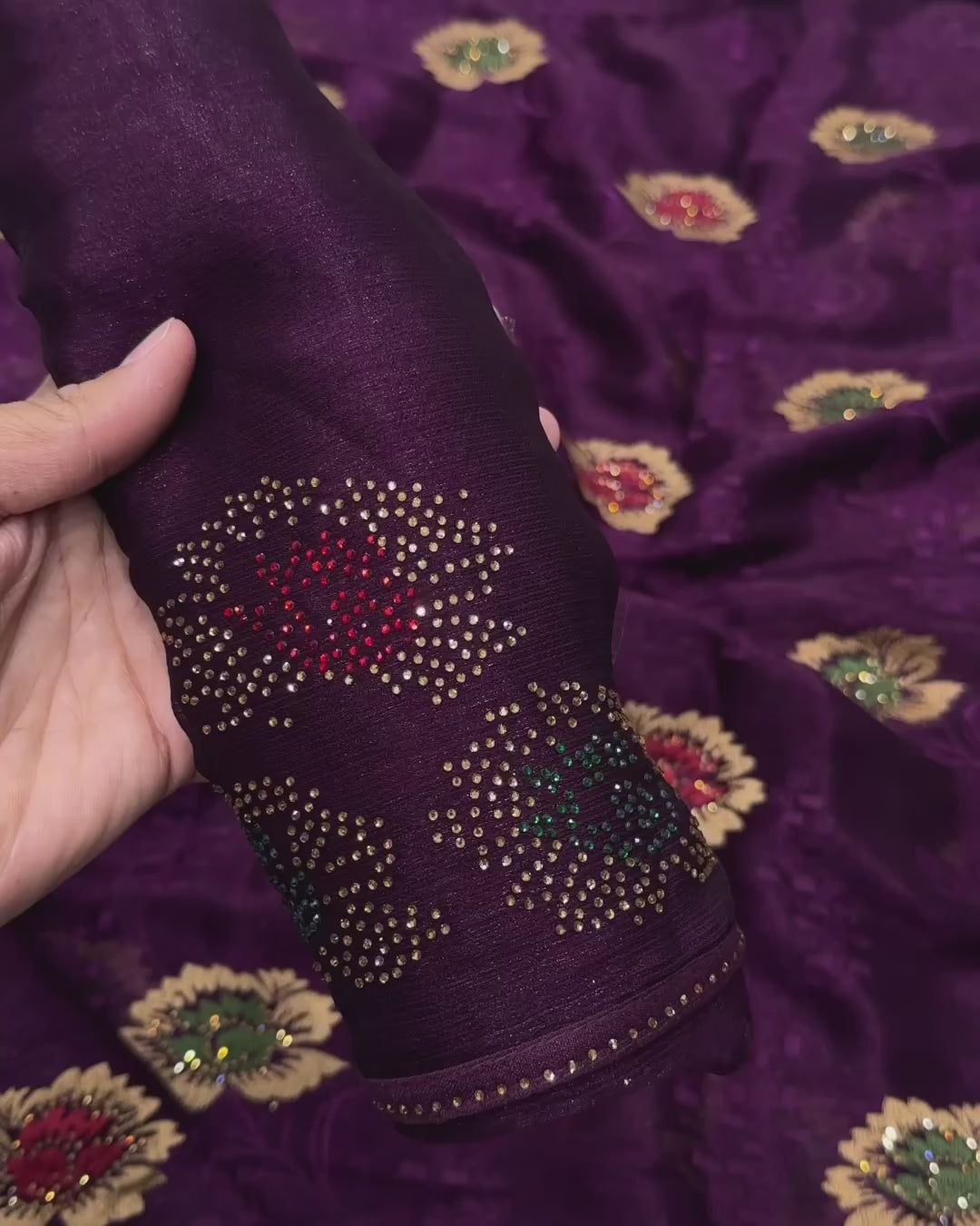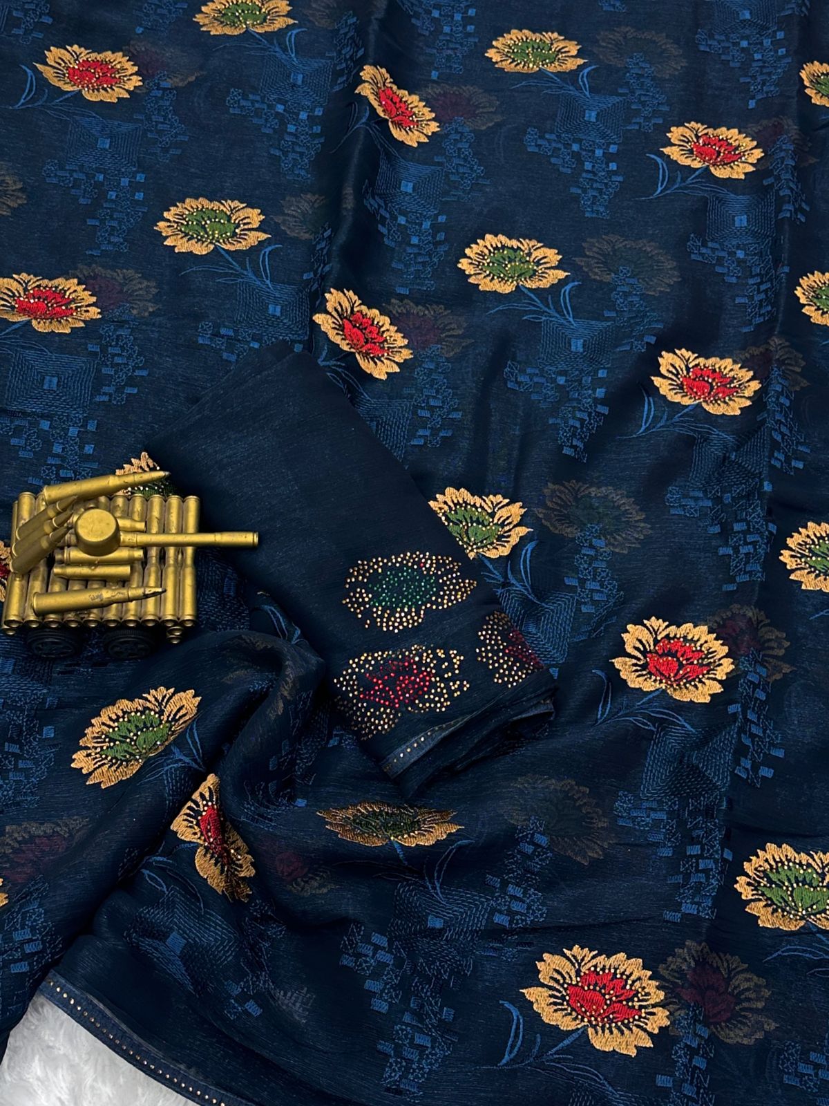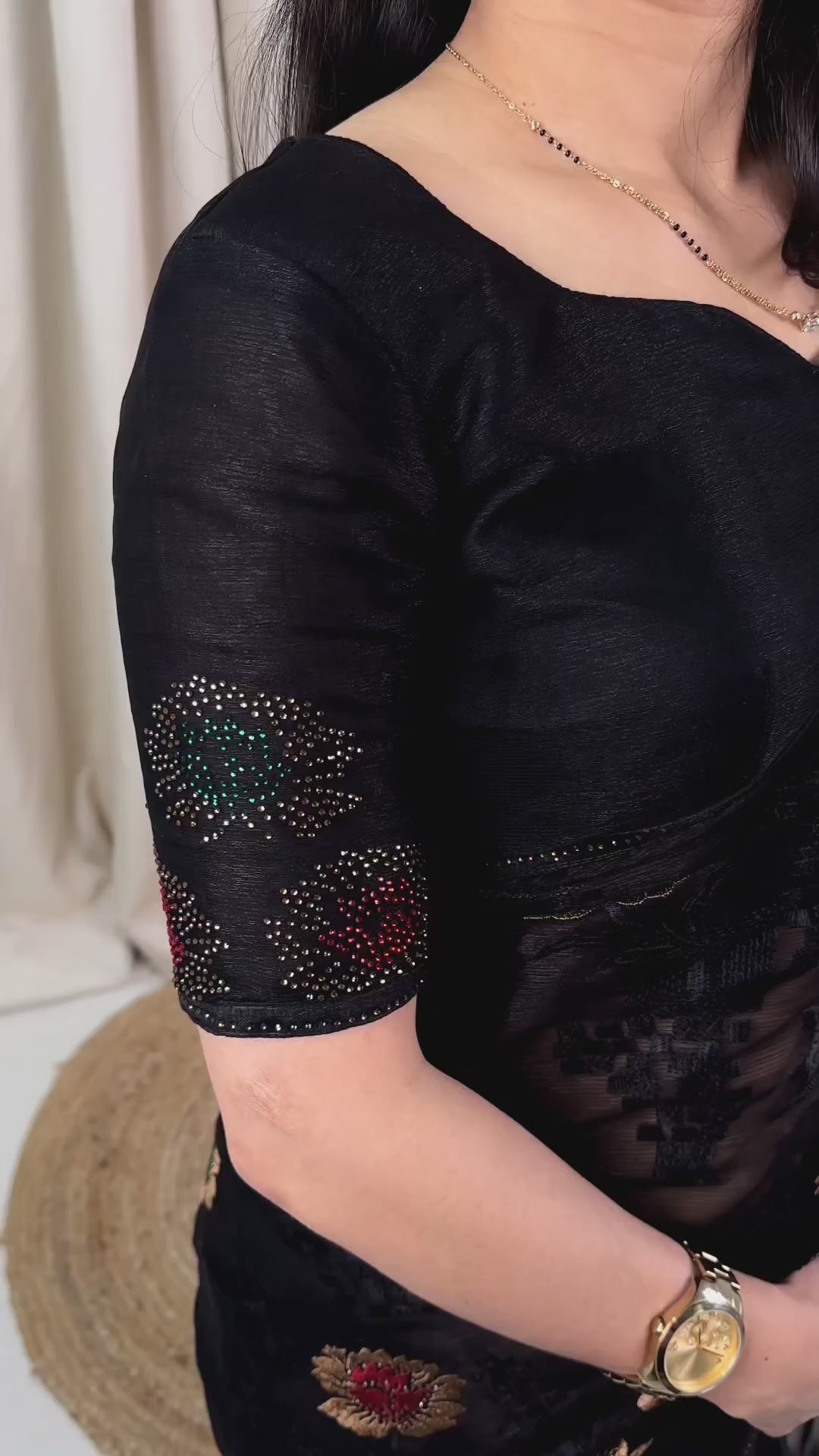 Blouse features three-color Swarovski butta work, adding a designer finish